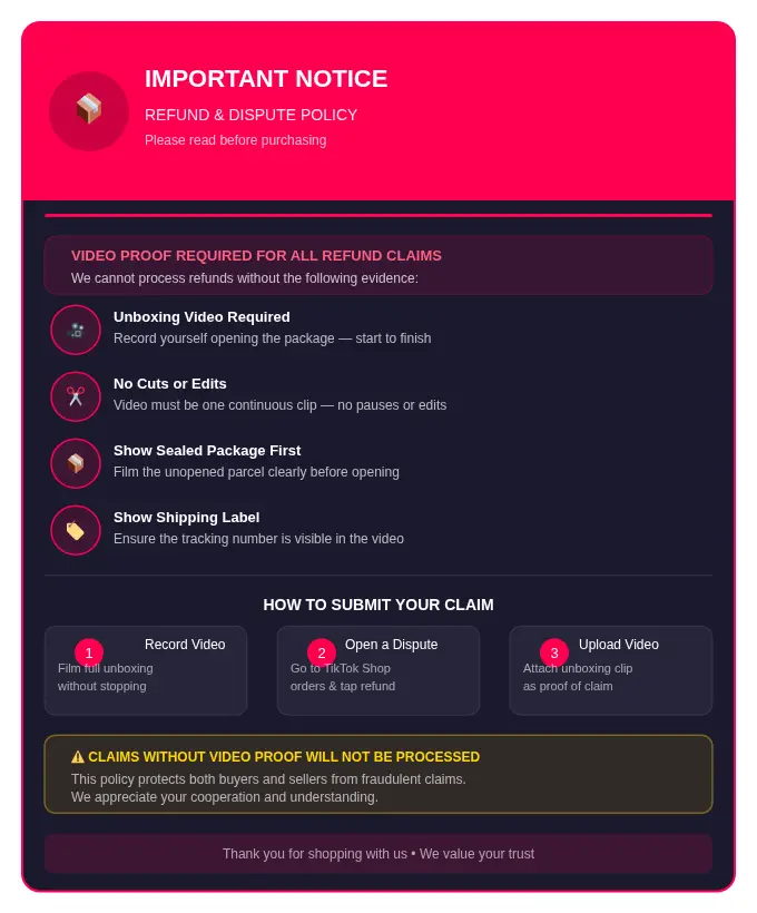 To protect both buyers and sellers, all refund claims require an unboxing video as proof. The video must be one continuous clip — no cuts or edits — showing the sealed package and shipping label clearly before opening. To submit a claim: record your full unboxing, open a dispute via TikTok Shop Orders, and attach the video as proof. Claims submitted without video evidence will not be processed. Thank you for your understanding and cooperation.