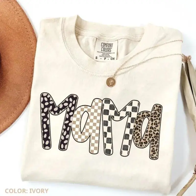 5. Leopard Mama Graphic T-Shirt, Retro Checkered Mom Tee, Trendy Mother’s Day Gift Shirt, Cute Neutral Mama Outfit, Women’s Aesthetic Tee (100% Cotton)