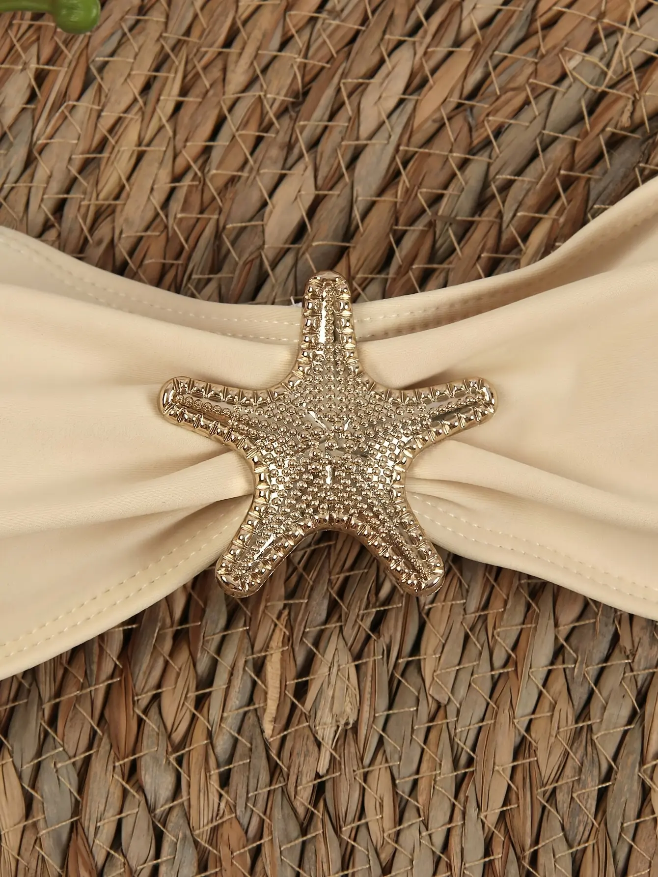 Textured Two Piece High Waist Bikini Set for Women, Beige Cut Out Bathing Suit with Gold Metal Buckle, Summer Beach Swimwear