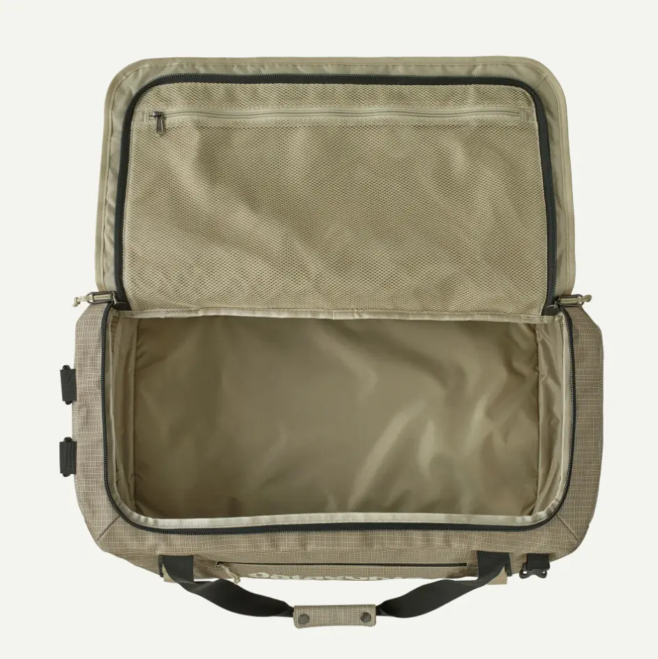 A zippered side pocket can be reached from the outside or inside of the bag, and when empty, the duffel stuffs into the pocket for compact, self-contained storage; an interior mesh lid pocket keeps essentials organized and close at hand