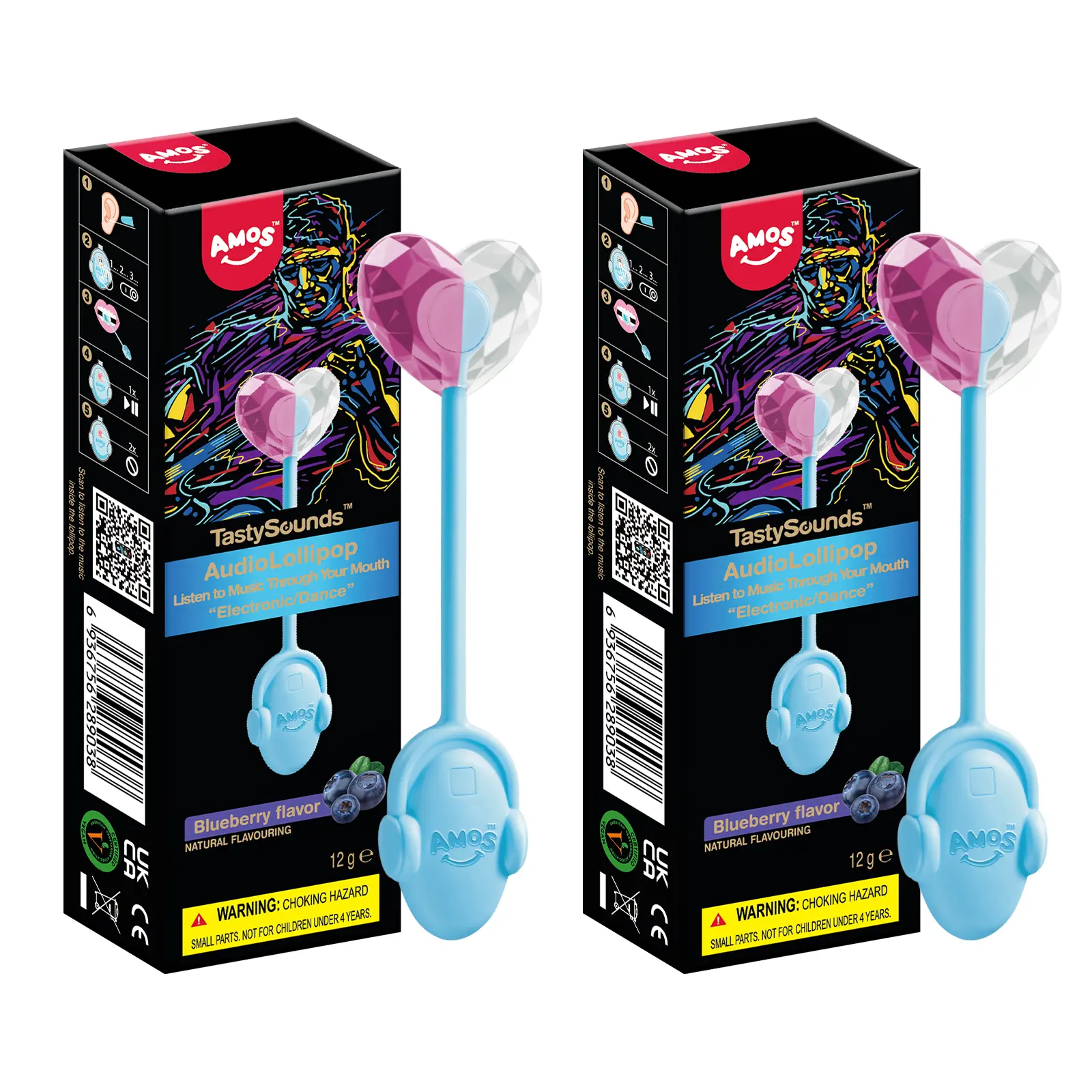 Turn candy time into a multi-sensory experience. AMOS TastySounds Audio Lollipop combines sweet fruity flavors with built-in sound technology, letting you enjoy music in a completely new way — through your mouth.