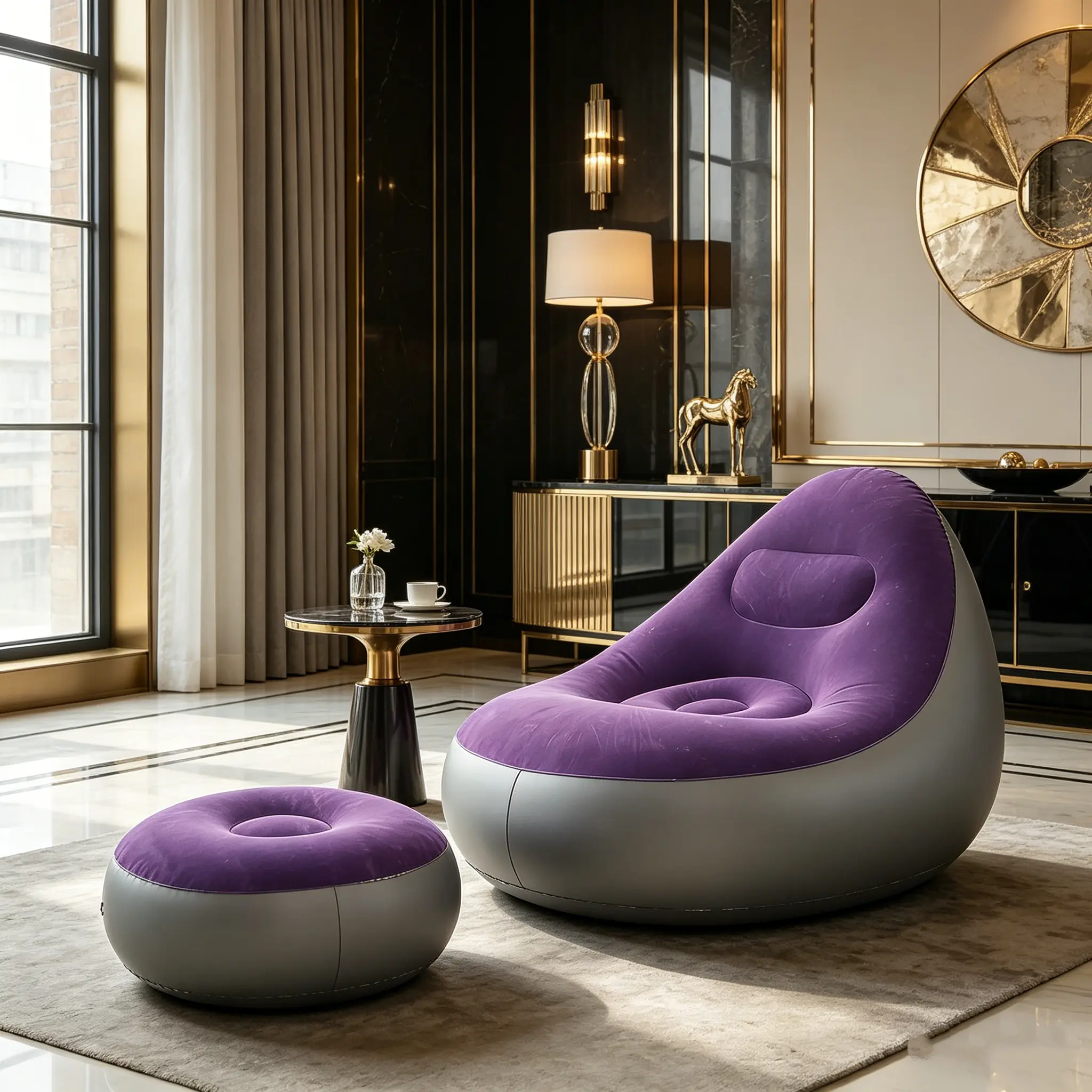 1pc purple Foldable Inflatable Recliner with Footrest, Comfortable Flocked Nylon Texture, Portable Lightweight Lounge Sofa for Home Bedroom Balcony Camping Outdoor Use