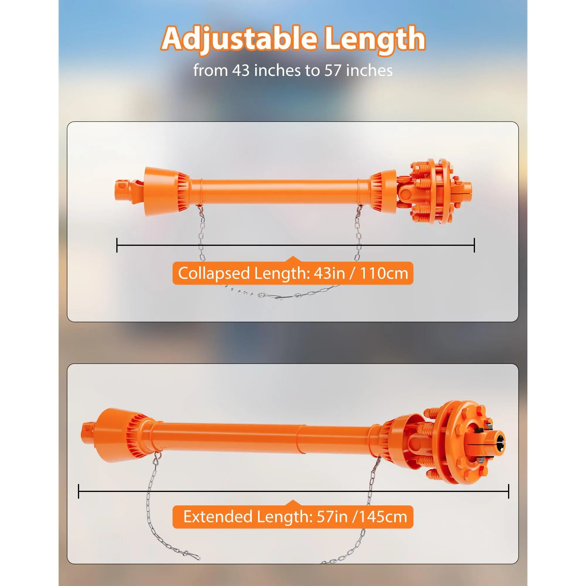 【Adjustable Length and Power】: The tiller PTO shaft is designed with a telescoping steel tube, universal joint, and yokes, offering compressed and extended lengths of 43 in and 57 in. It provides 35 Hp, 26 Kw, and 460 Nm torque at 540 rpm, and 53 Hp, 39 Kw, and 360 Nm torque at 1000 rpm, allowing for differential speeds of the PTO driveline shaft.