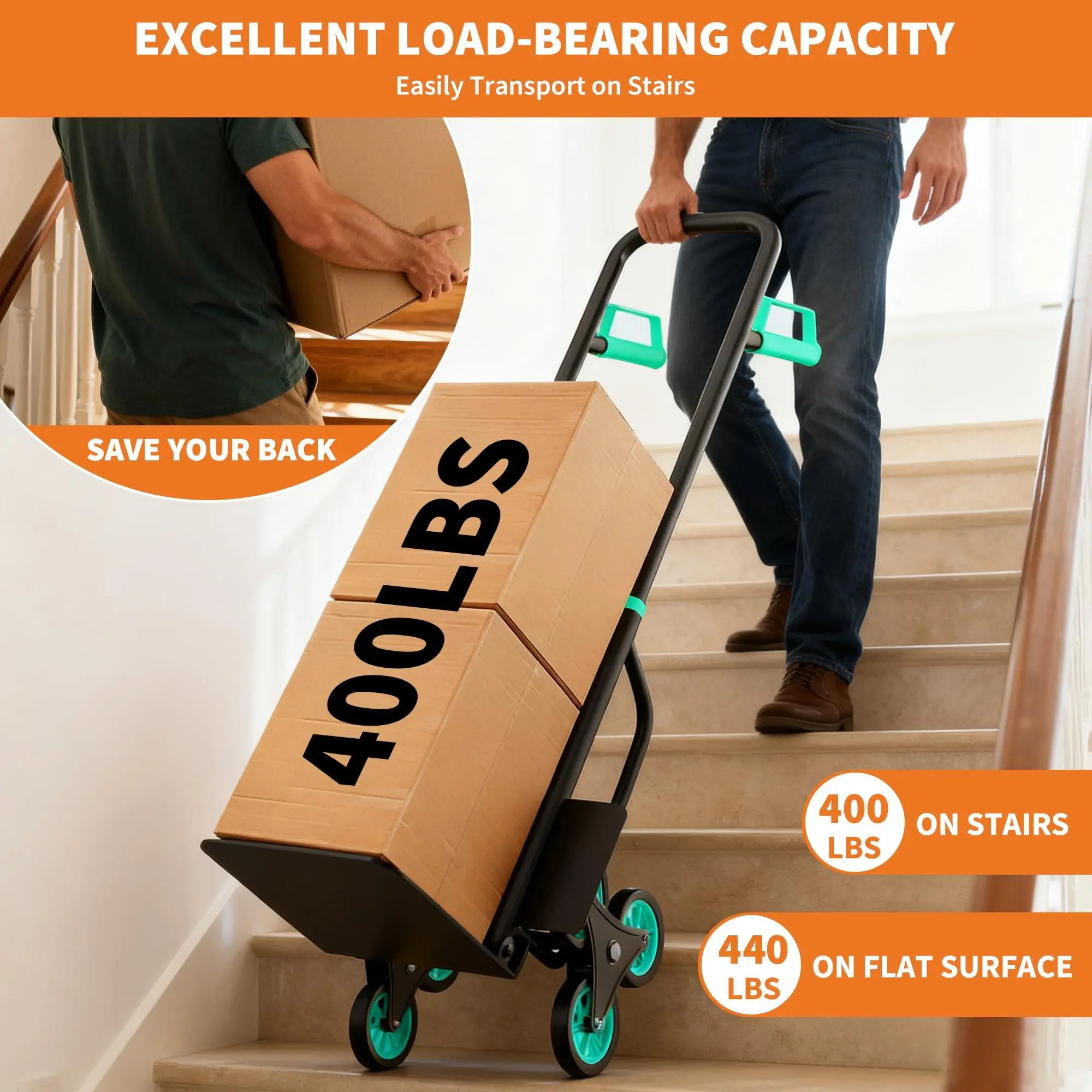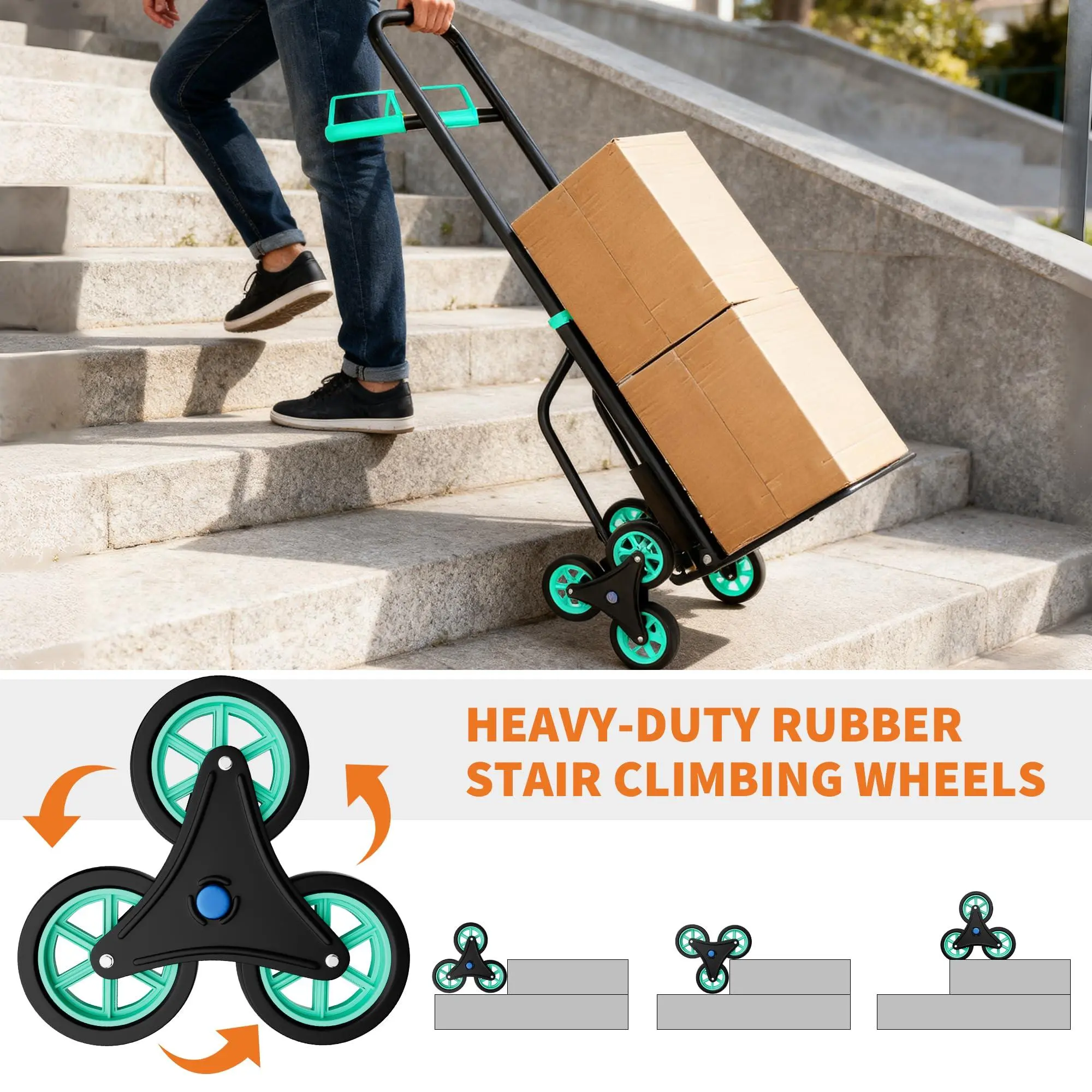 Stair Climbing Feature: Equipped with advanced stair climbing wheels, this stair dolly and stair climber cart effortlessly navigates stairs, reducing strain and increasing safety.