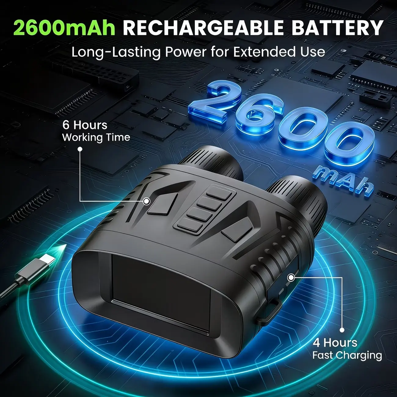 Discover the Night Vision Goggles, ideal for wildlife observation, hunting, and camping. Equipped with a 2600 mAh battery, these binoculars ensure long-lasting use. The 7 levels of infrared technology provide clear visibility in low light. With 10X digital zoom, you can explore distant objects in detail. Perfect for adventurers seeking enhanced night vision.
