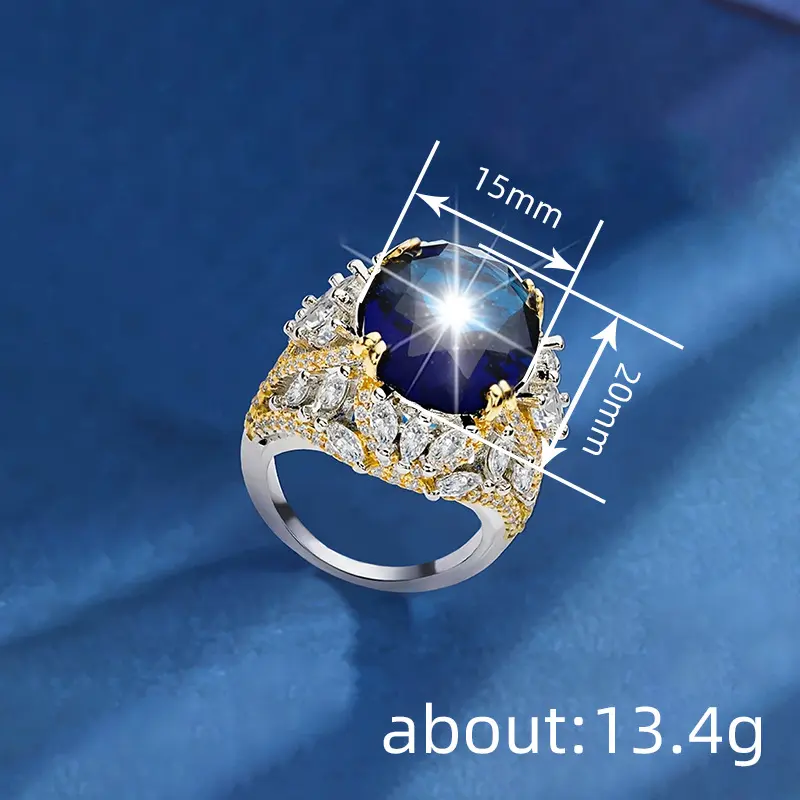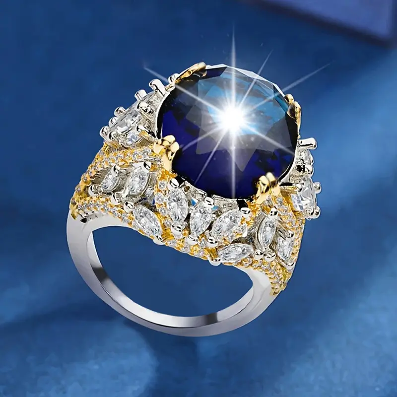 ·💎 Stunning Simulated Sapphire: Large, eye-catching marquise-ellipse cut center stone in a rich deep blue, mimicking a fancy sapphire for maximum drama.