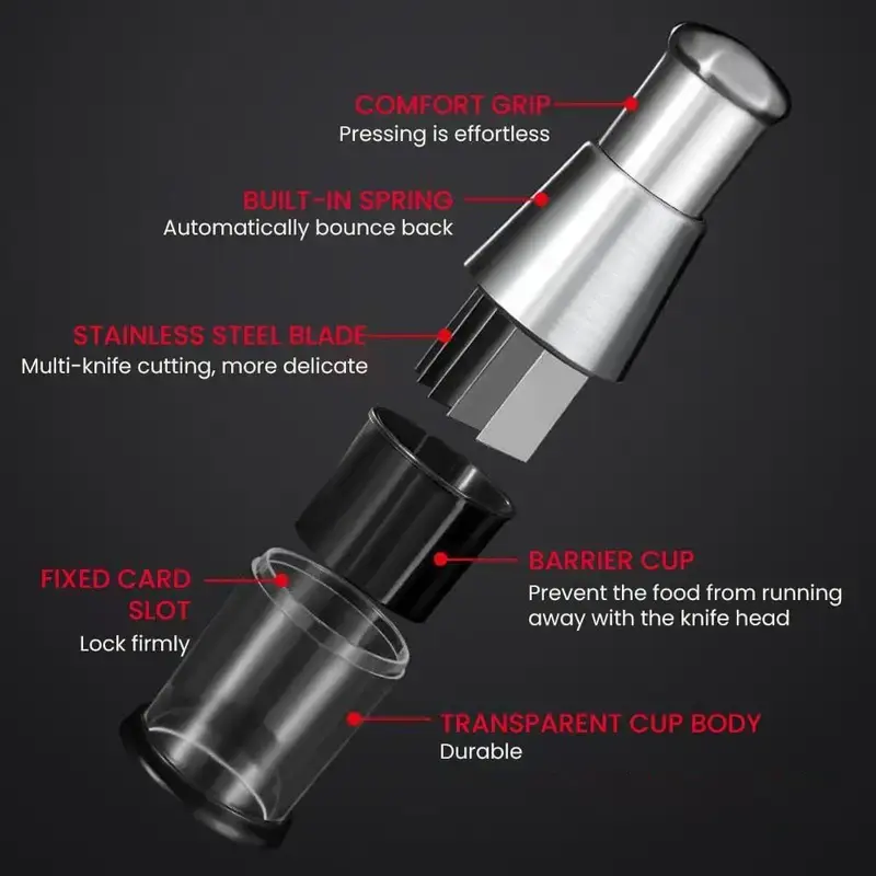 The handle of the garlic masher is designed ergonomically to ensure safety and comfort, keeping your hands away from theblade.By pressing down the handle, you can achieve a finer cut.This manual tool is efficient for preparing ingredients quickly,cutting fruits and vegetables safely without the need for batteries.lt is lightweight and portable, making it convenient for use in various locations.