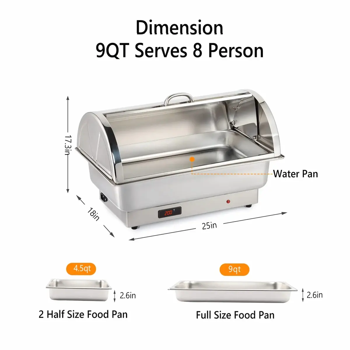 Technical Specifications: Brand: ROVSUN Weight: 10.25 lb./Each Length: 25 Inches Width: 18 Inches Height: 17.3 Inches Capacity: 9 qt. Color: Silver Shape: Rectangle Service Capacity: At Least 8 People(Single) Material: Food Grade Stainless Steel NSF Certification: Yes Food Pan Size: 20.9" x 12.8"x 2.5" (L x W x H) Water Pan Size: 20.9" x 12.8"x 4.1" (L x W x H)