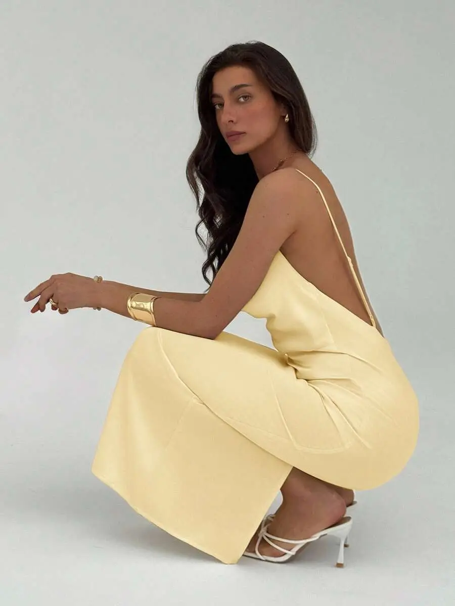AREUM Elegant Solid Color Plunging Neckline Dress - Sexy Backless Ceremony Dress for Summer Wedding & Special Occasions