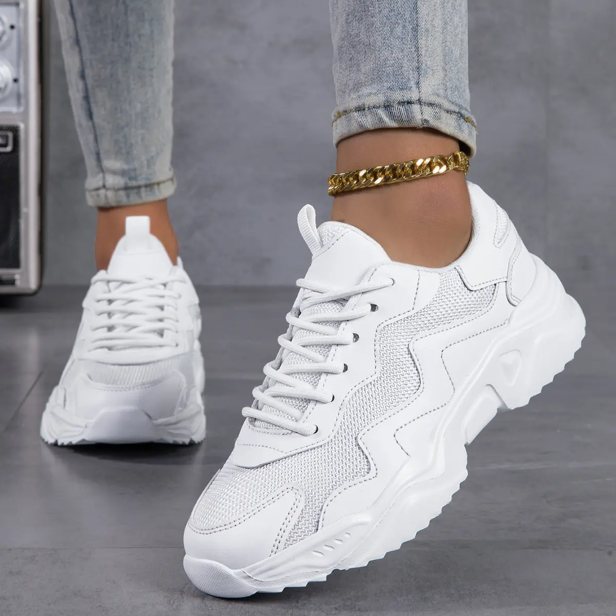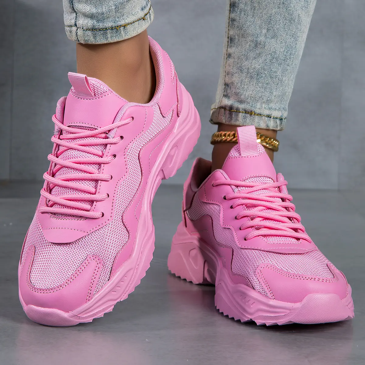 Women's Solid Color Casual Sneakers - Breathable Sneakers with Thick Sole, Low-top Lace-up Walking Shoes, EVA Sole, Fabric Lining - Cortable Ankle Sock Shoes for Fitness and Walking, Fashionable Shoes for All Seasons - For Women .