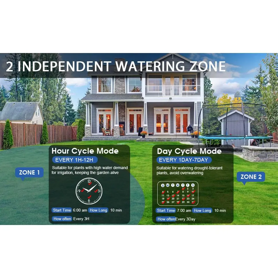 Watering Timer with 2 Zones: Sprinkler timer with 2 zones can irrigate different gardens and yards at the same time according to your needs, watering timer can be set.Watering Duration is 1min-3h59min, Watering Frequency from 1-12 hours or 1-7 days watering your lawn efficientlyRain Delay Mode: Watering timer with rain delay empowers you to suspend your irrigation plan for either 24H/49H/72H, ensuring that achieve significant water conservation.With this irrigation timer, it takes good care of your garden and you can have a good vacationDurable Hose Timer: The irrigation hose timer boasts IP54 waterproof, ensuring that hose timer will not be damaged in rain.Additionally, the battery compartment is equipped with an sealing strip to prevent water from entering watering timer can be used all year round360° Rotatable Interface: The interface of hose timer is suitable for general water pipes, and it can be rotated 360° for easy installation.Interface is equipped with a 3/4 inch gasket and a 3/4 filter, which can filter out some unclean impurities and make your garden cleanerLow-Battery Warning: Sprinkler timer is compatible with 2* AAA 1.5-volt alkaline batteries (not included), this timer promises longevity, with a service life expectancy of 6 to 8 months.When the low battery indicator appears, the valve will close automatically to avoid leakage
