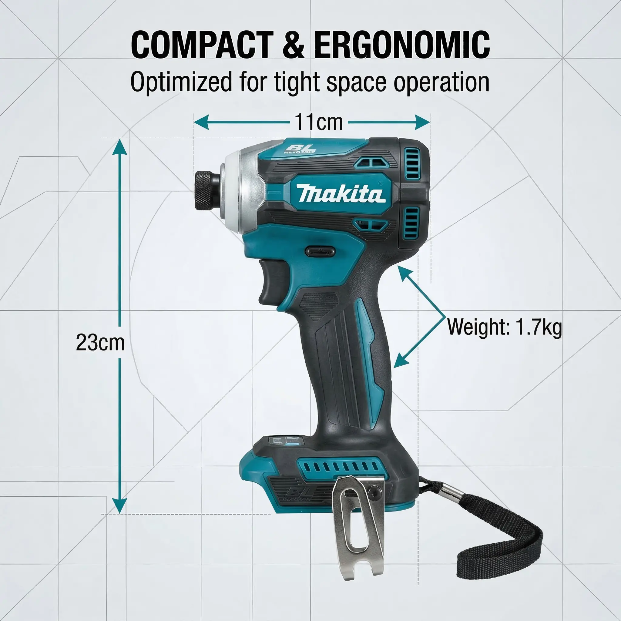 Makita DTD171 brushless impact drill is equipped with an 18V lithium battery, with a maximum tightening torque of 180Nm, suitable for M4-M8 screws and M5-M16 bolts. The three speed range (0-3600rpm) meets different task requirements, with an impact rate of 3800 per minute, providing efficient and long-lasting power.
