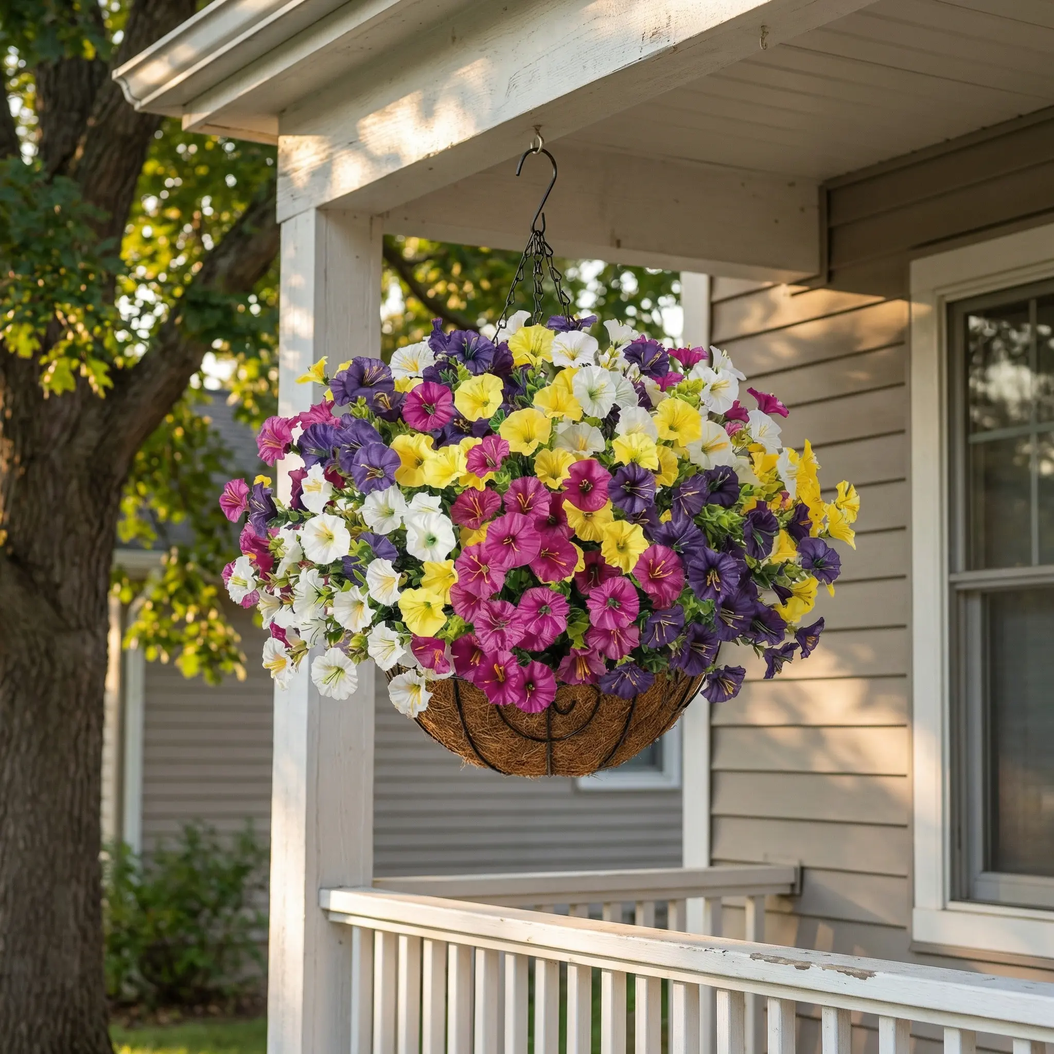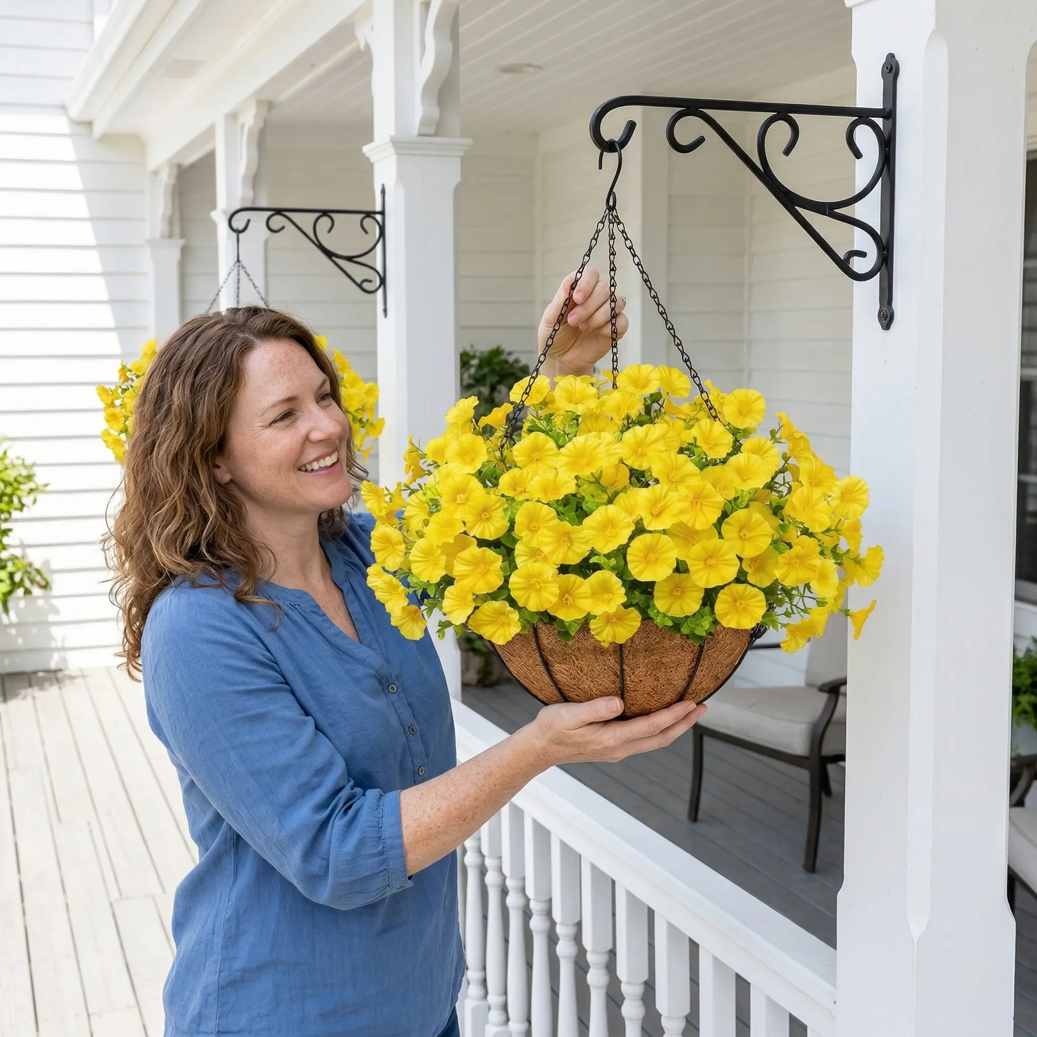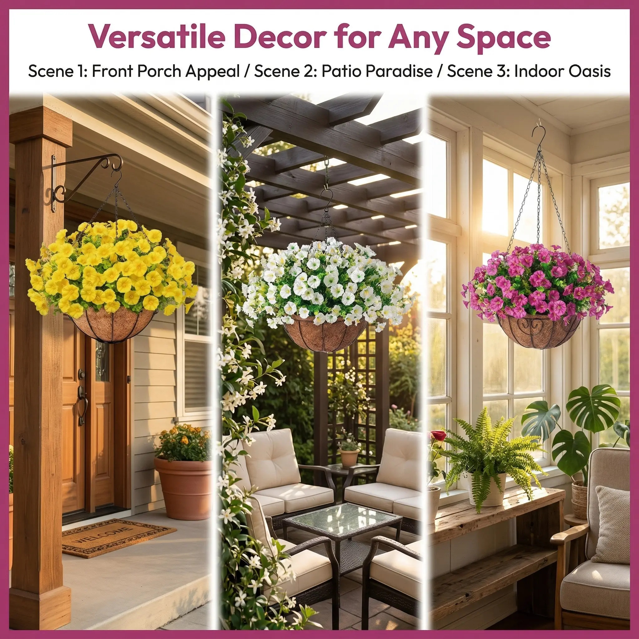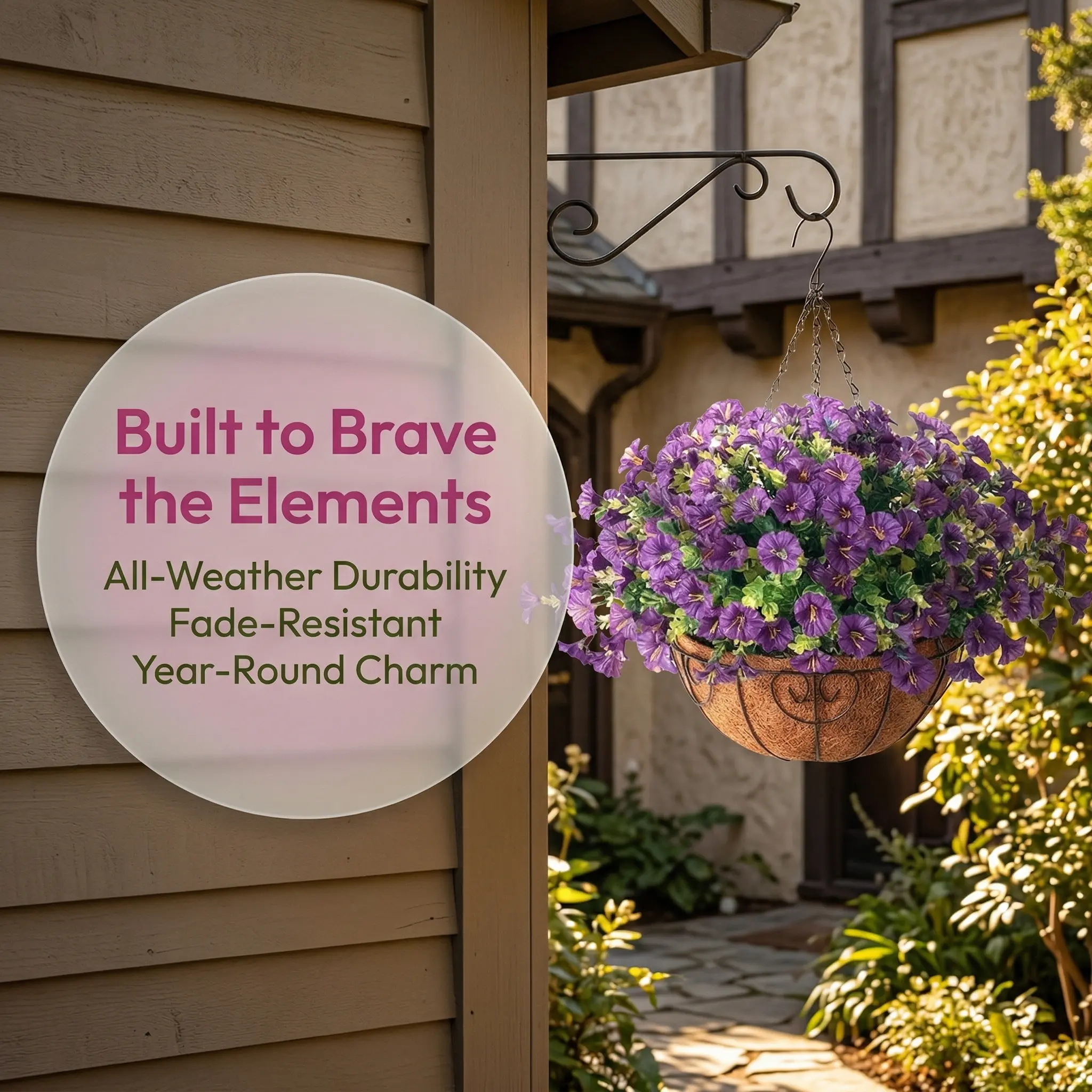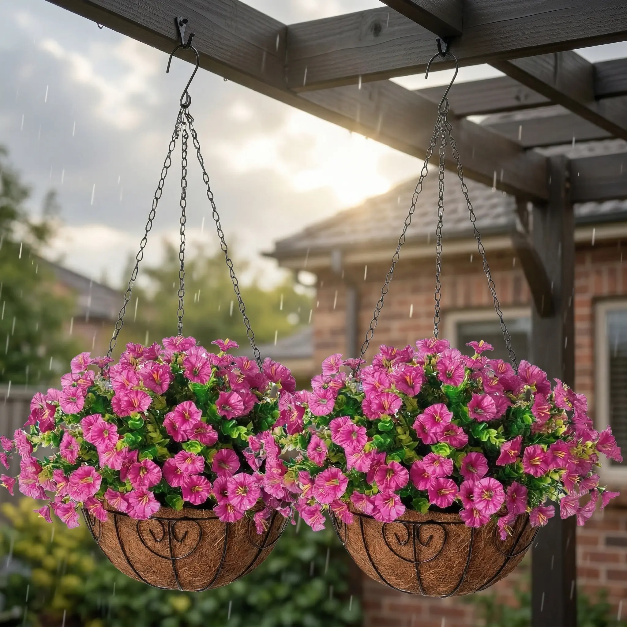 Our Artificial Hanging Flower Baskets feature high-quality silk blooms that look incredibly realistic from any distance. Each basket comes pre-assembled with a natural coconut fiber liner and a sturdy metal chain, ready to hang on your porch, patio, or indoor entryway. Designed to withstand the elements, these UV-resistant flowers stay vibrant through sun and rain, making them a smart choice for busy homeowners who love a touch of nature.
