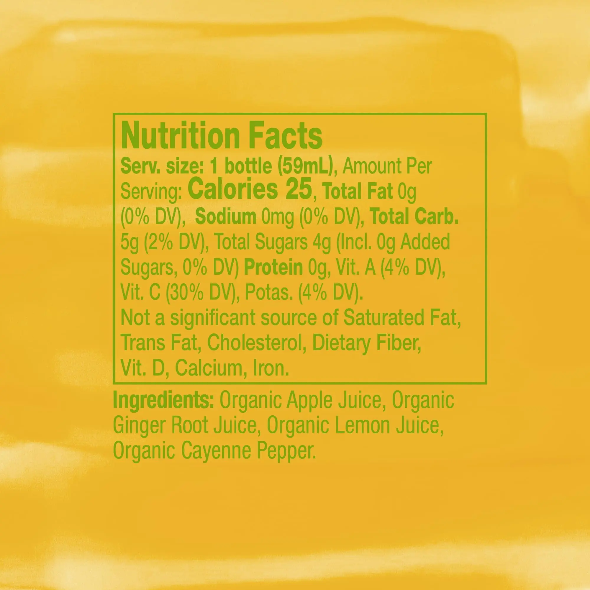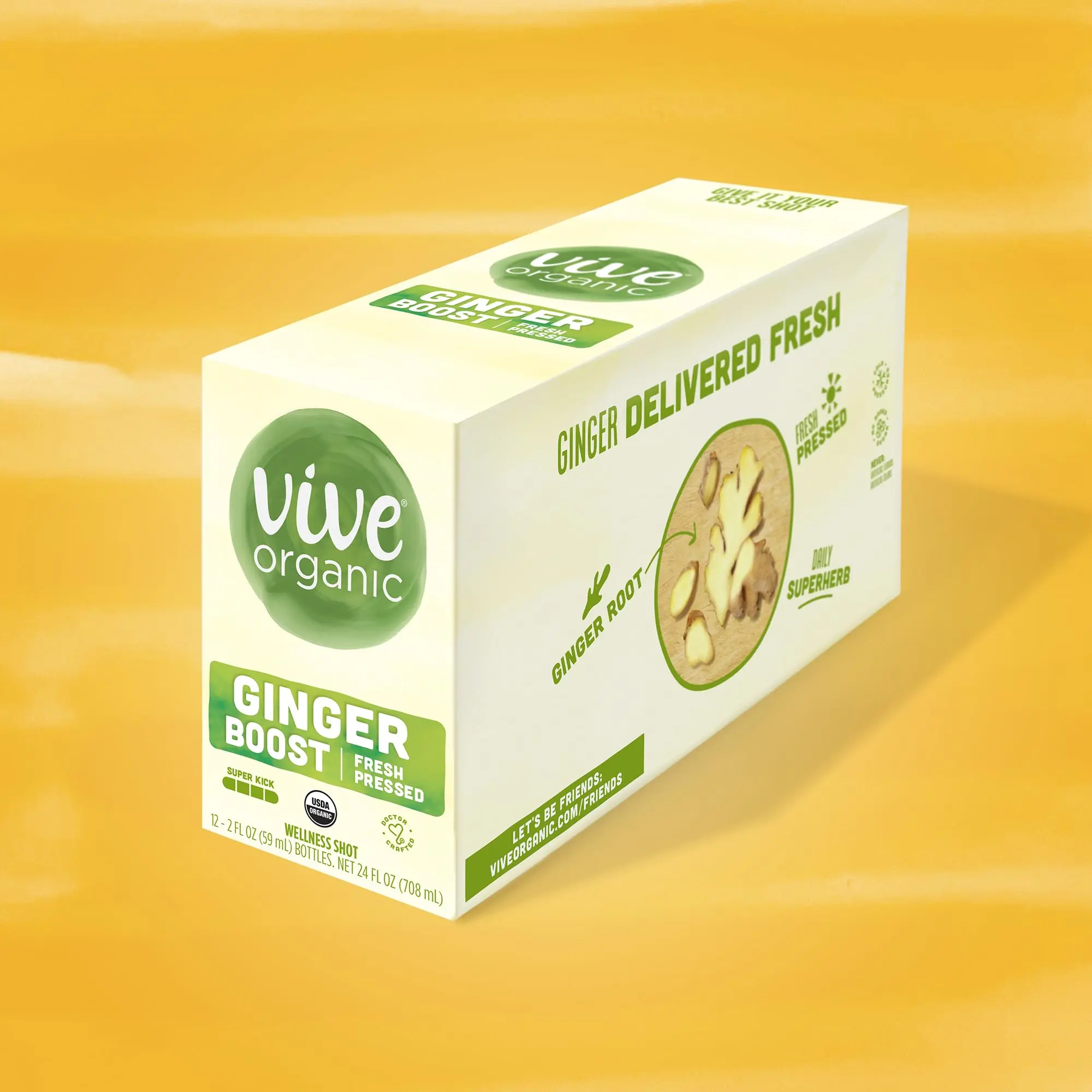 Vive Organic Ginger Boost Fresh Pressed Wellness Shot gives you an extra-strong dose of ginger and fresh superfood favorites to kickstart your day. Who has time to eat or juice all the superfoods you need? Get all your immunity-boosting goodness in under five seconds with this organic juice shot. Each 2 fl oz immunity shot features a farm-fresh blend of ginger root, organic apple juice, organic lemon juice and organic cayenne pepper for a super kick. For best results, take one ginger shot daily. Enjoy a potent juice shot before breakfast, school or traveling, or use one as a post-workout shot. Our team of holistic wellness doctors crafted the most synergistic balance of fresh-pressed superfoods to create a potent daily immunity shot that gives you a powerful kick you can feel. Vive shots contain no added sugar, artificial ingredients, flavors or colors and are never watered down, so you get the fresh proactive defense you need. Vive Organic Shots power your immune system while also embracing stewardship of the planet. This includes using recycled plastic and "ugly" produce to reduce food waste. Make proactive immunity support part of your daily routine, and spark your immunity with potent juice shots that pack a punch. You’ll feel it.