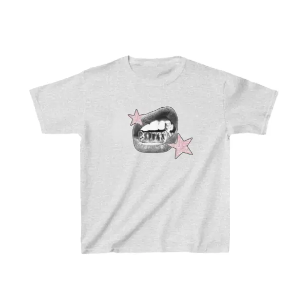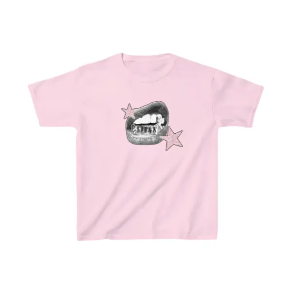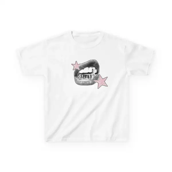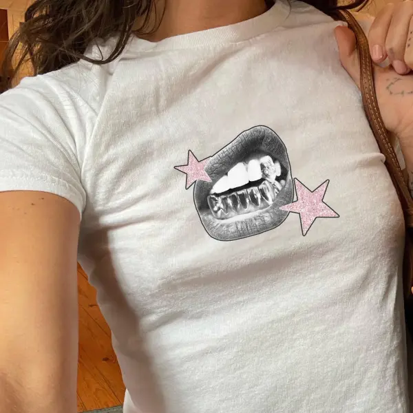 5. Women's Y2K Baby Tee, Icy Grillz Lips Graphic with Pink Glitter Stars Print