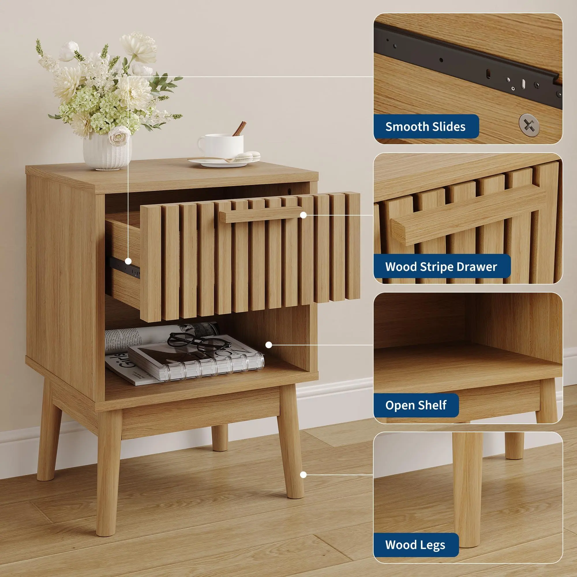 BOHO STRIPED AESTHETIC: Featuring an elegant striped design combined with a warm, natural oak color finish. This nightstand adds a touch of modern bohemian charm to your bedroom or living room, serving not just as a piece of furniture, but as a decorative art piece that elevates your home decor.
