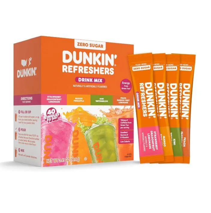 ·Each box comes with 40 individual drink mix sticks of Dunkin Refreshers Singles To Go! drink mix, available in 4 delicious flavors. Naturally and artificially flavored drink mix. For best results, mix one stick with 16.9 FL OZ of water.