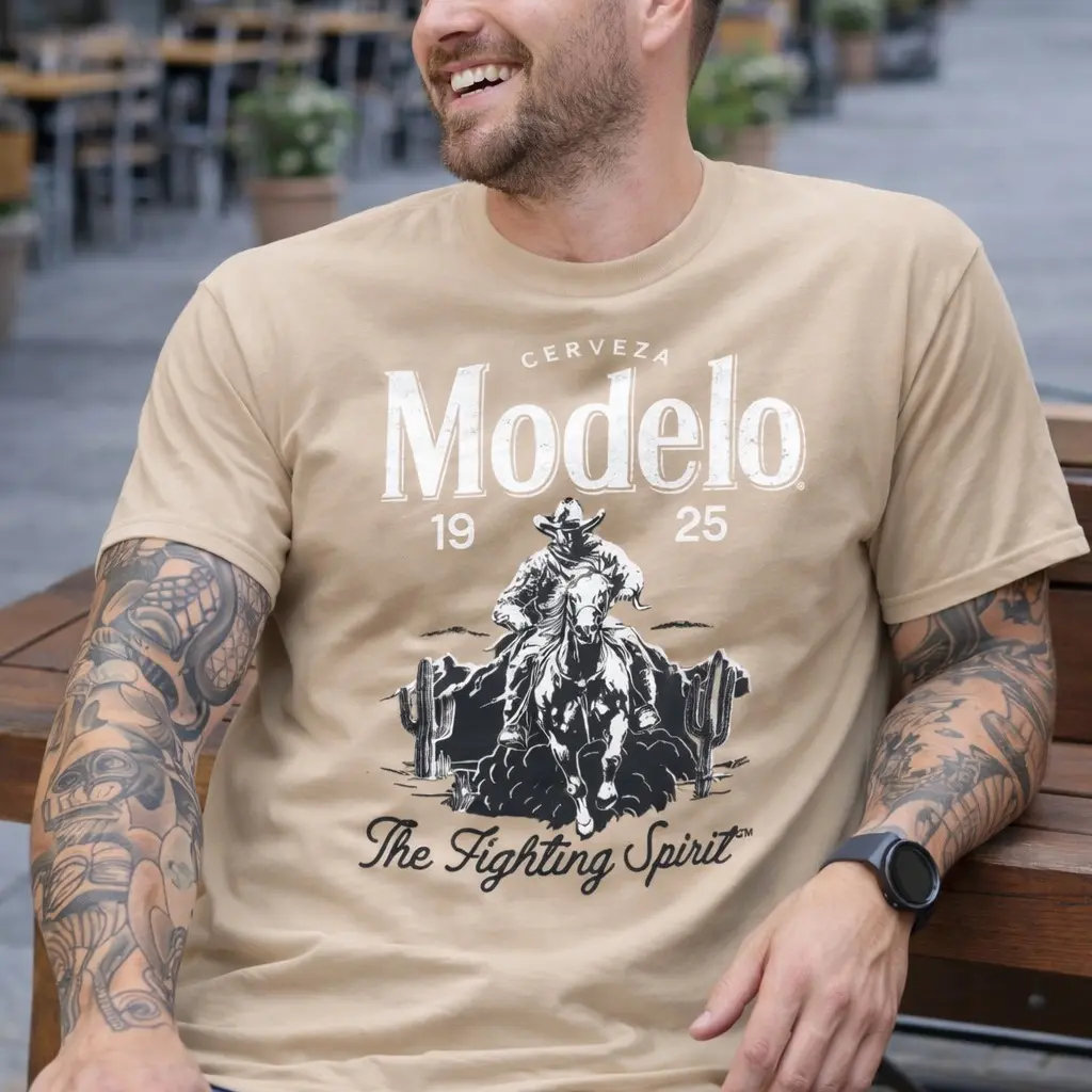 Channel rugged charm and timeless style with this vintage-inspired Modelo graphic tee, featuring a bold cowboy rider design paired with classic typography. The earthy tones and retro aesthetic give it that authentic, worn-in feel—perfect for those who appreciate heritage, grit, and a laid-back lifestyle. Whether you're out with friends or kicking back, this shirt brings effortless cool with a nod to tradition.
