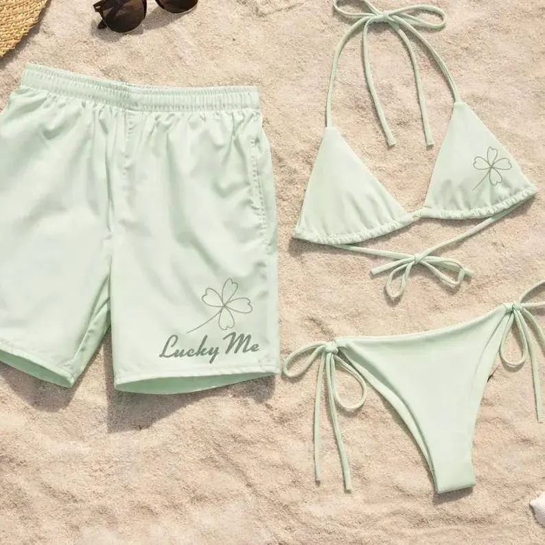 5. Lucky Me Four Leaf Clover Matching Couple Swimwear Set Board Shorts Triangle Bikini Mint Green St Patricks Day Irish Lucky Charm Summer Beach Pool Outfit