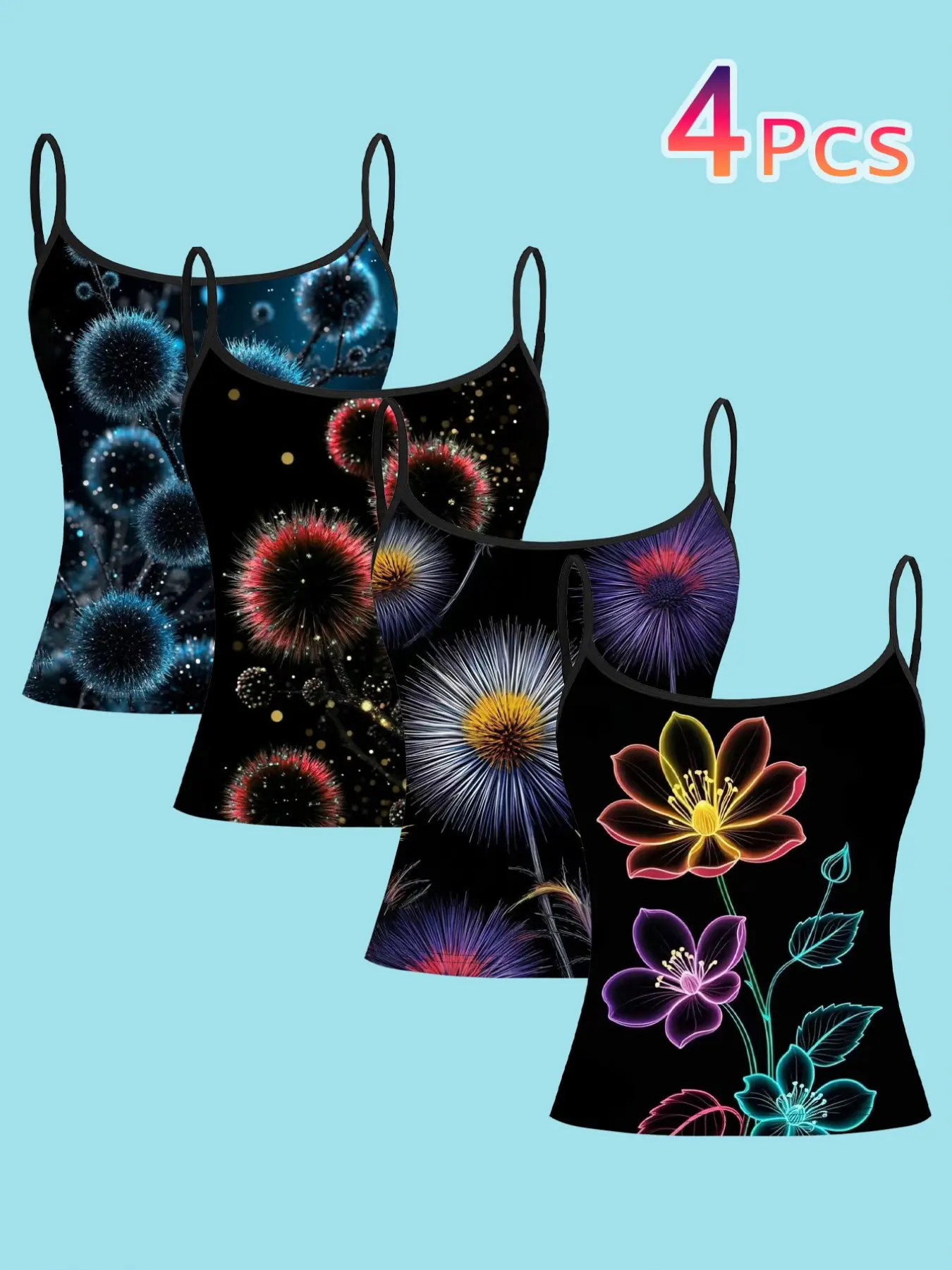 Neon Fluorescent Floral Print Strappy Top, Cyberpunk Slim-Fitting Shirt, 4-Piece Set, Casual Style, All over Print, Fashionable Clothing