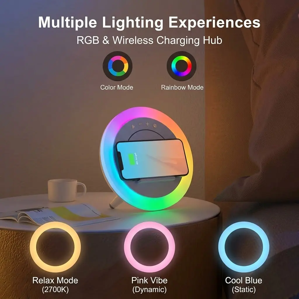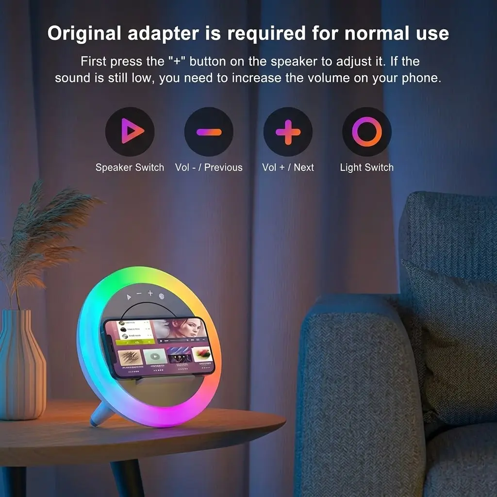 This cool Bluetooth speaker offers 4-in-1 functions: Bluetooth speaker, night light, wireless charging station, and phone holder. Humanized buttons let you easily control volume, skip songs, and answer calls. Perfect for bedrooms, it's a great unisex gift. Use the provided adapter for normal startup.