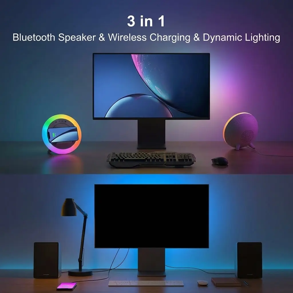 4-in-1 Wireless Induction Charging Bluetooth Speaker with LED Light, Universal Speaker Base & Standwith Surround Sound, Portable Desktop Holder for Home, Bathroom, Decoration, Unisex Gift