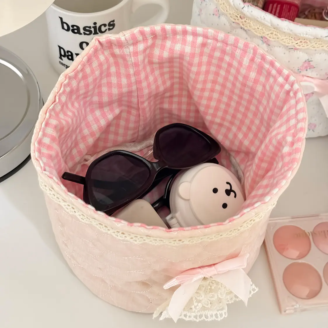 Sweetheart Lace Cylindrical Storage Basket – [Pink Checkered]