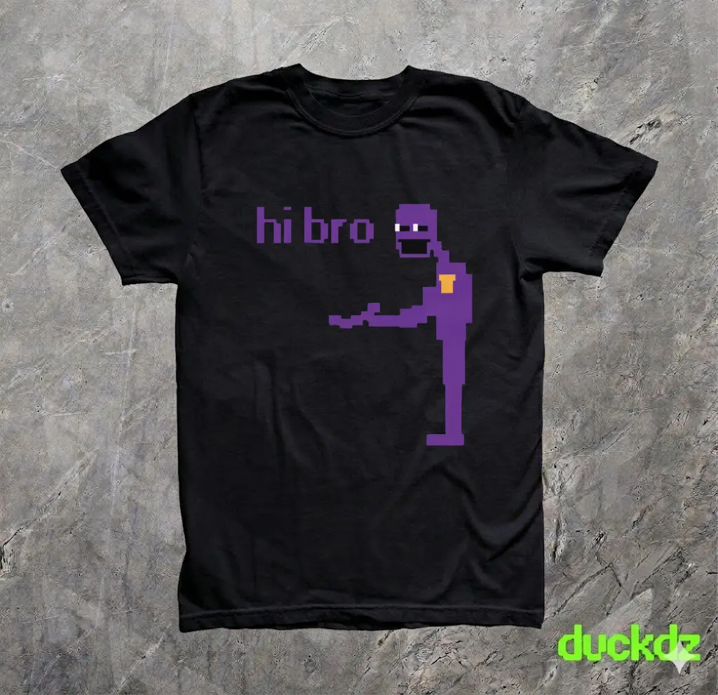 [Sale up to 30%] + [FREE SHIP] Purple Guy FNAF T-Shirt • Hi Bro Meme Tee • Vintage FNAF Graphic Shirt • Irony Memecore Swag Top for Kids & Fans