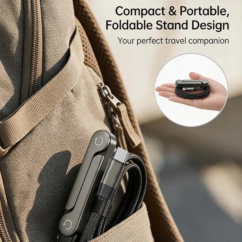 This 2-in-1 Type-C charging cable features an integrated invisible phone holder design, combining a sturdy stand and charging cord all in one sleek black accessory. Supporting 240W super fast charging, it powers up your devices rapidly while keeping your phone steadily propped at a perfect viewing angle. Compact and portable, it is ideal for gaming, working in the office, driving in the car, or traveling outdoors. Made with durable premium materials, the cable ensures stable charging performance and long-lasting use, bringing convenience to your daily life anytime and anywhere.