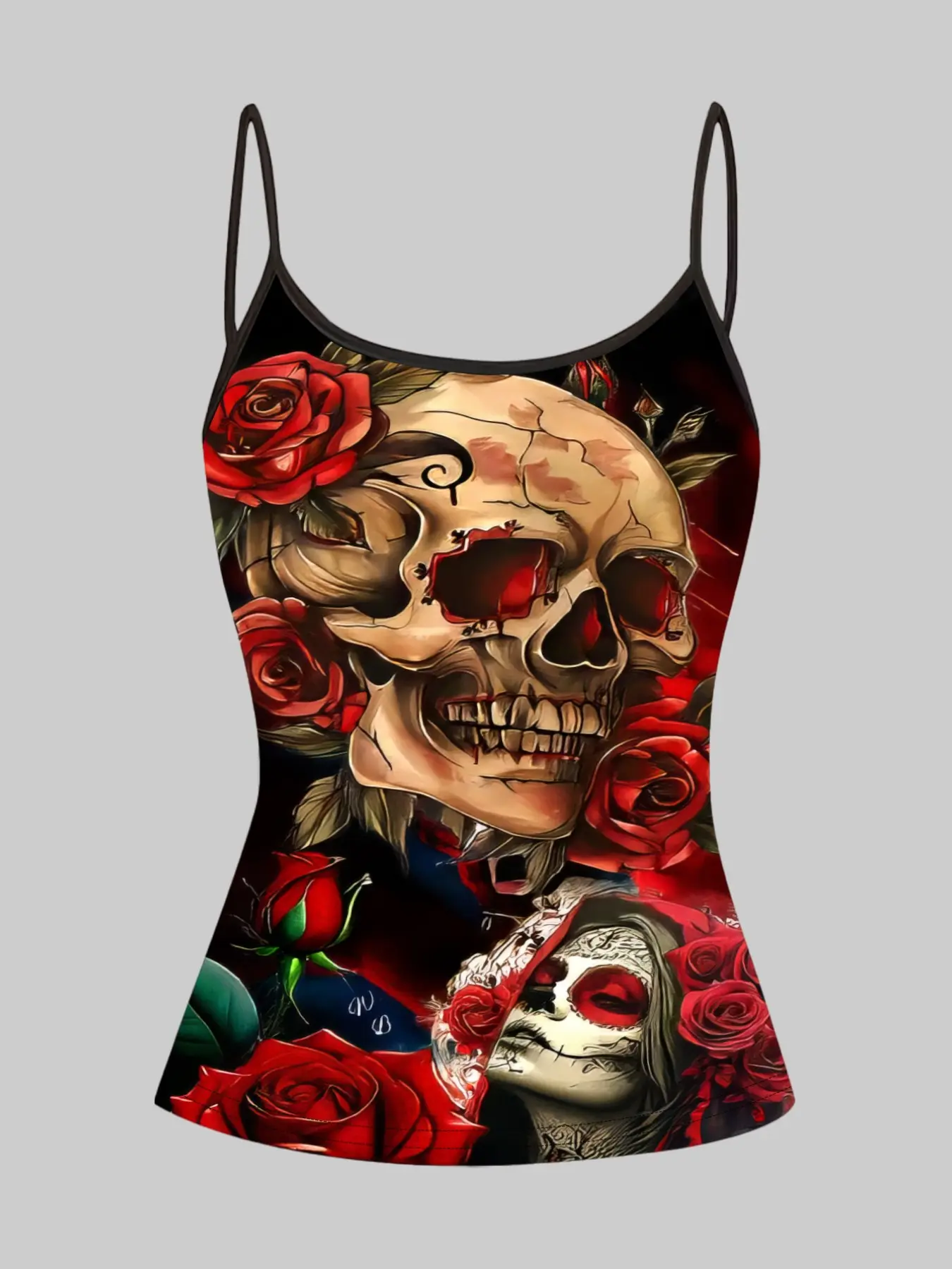 5. Gothic Skull Rose Print Straps, Summer Home Sleepwear Outer Wear, Unique Slim-Fit Top Set of Four Pieces, Casual All-Over Print Clothing