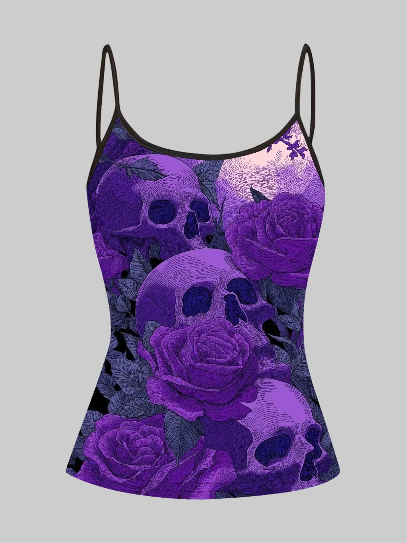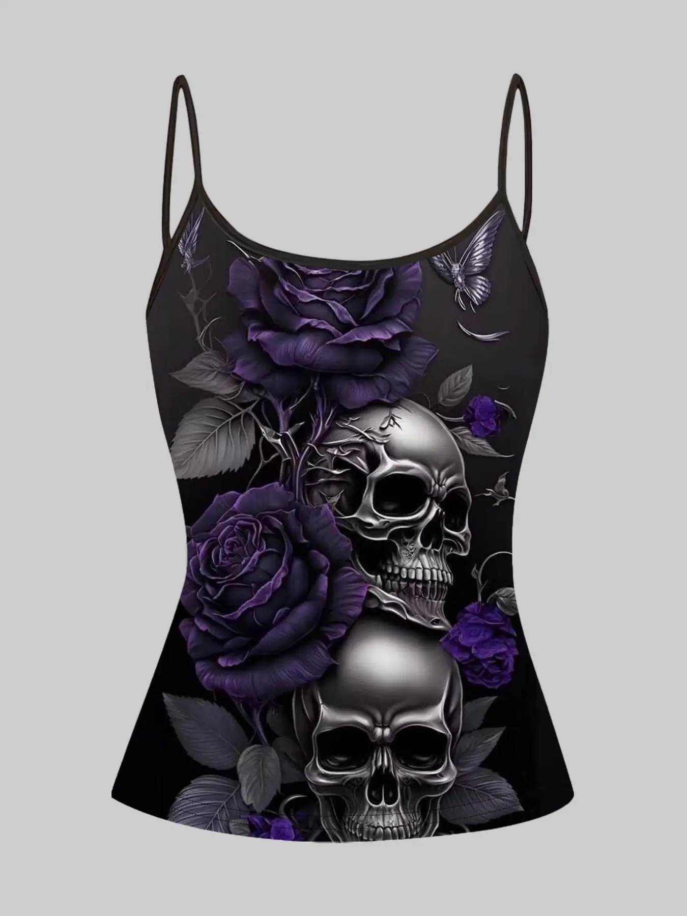 5. Gothic Skull Rose Print Strappy Top, Summer Home Sleepwear, Casual Slim-Fitting Outerwear, Unique Bodycon Shirt Set of Four