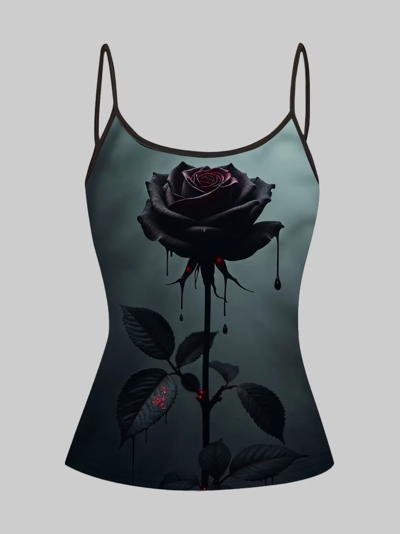 5. Dark Gothic Flame Rose Print Strappy Top, Summer Home Sleepwear Outerwear, Unique Slim Fit Shirt Set of Four Pieces