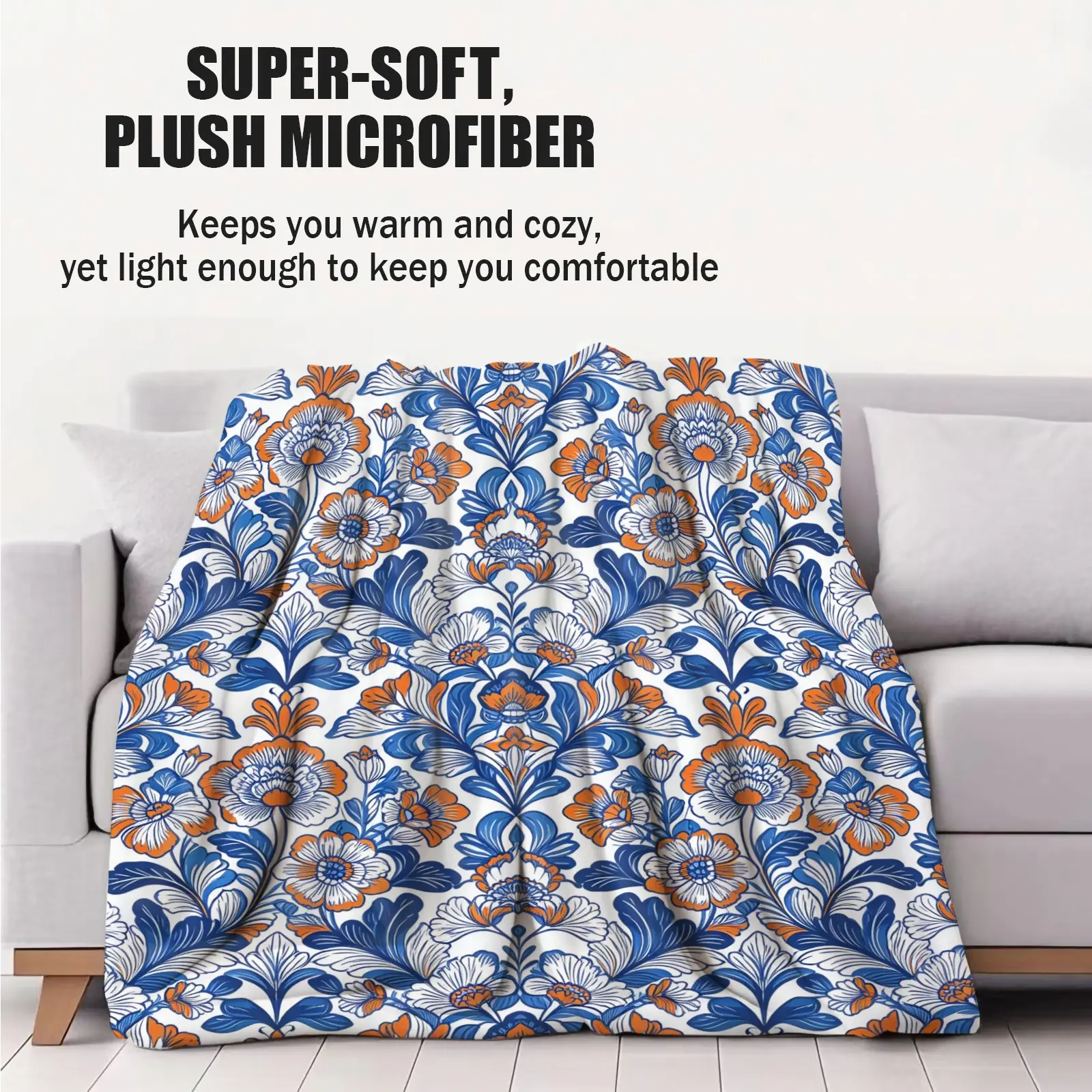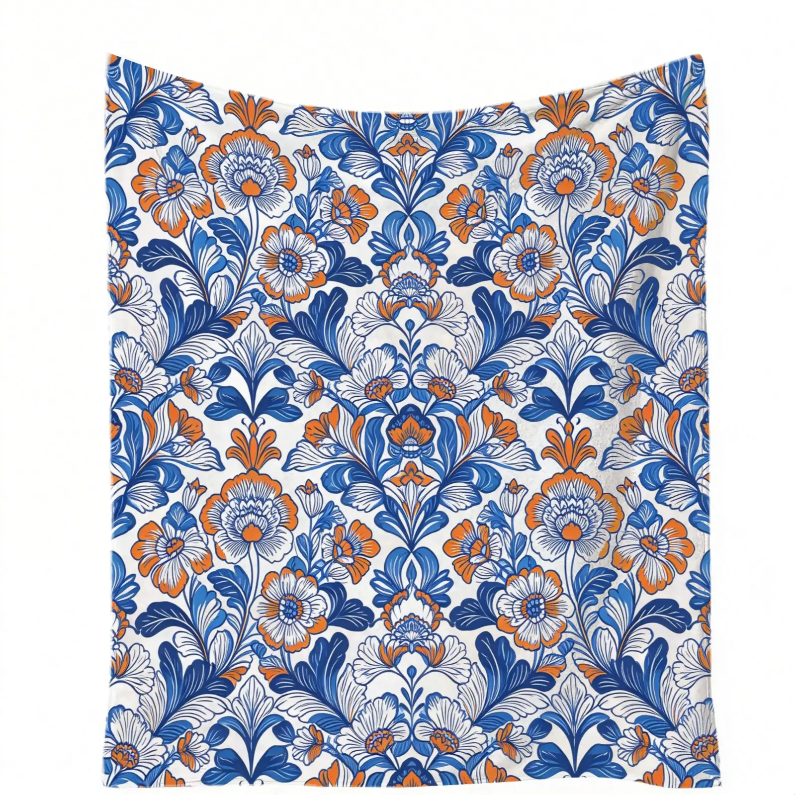 1 Piece Bohemian Blue Orange Floral Throw Blanket, HD Digital Single-Sided Printed Flannel Blanket, Super Soft Cozy Plush Gift Blanket for Sofa, Bed, Travel and Camping Decor