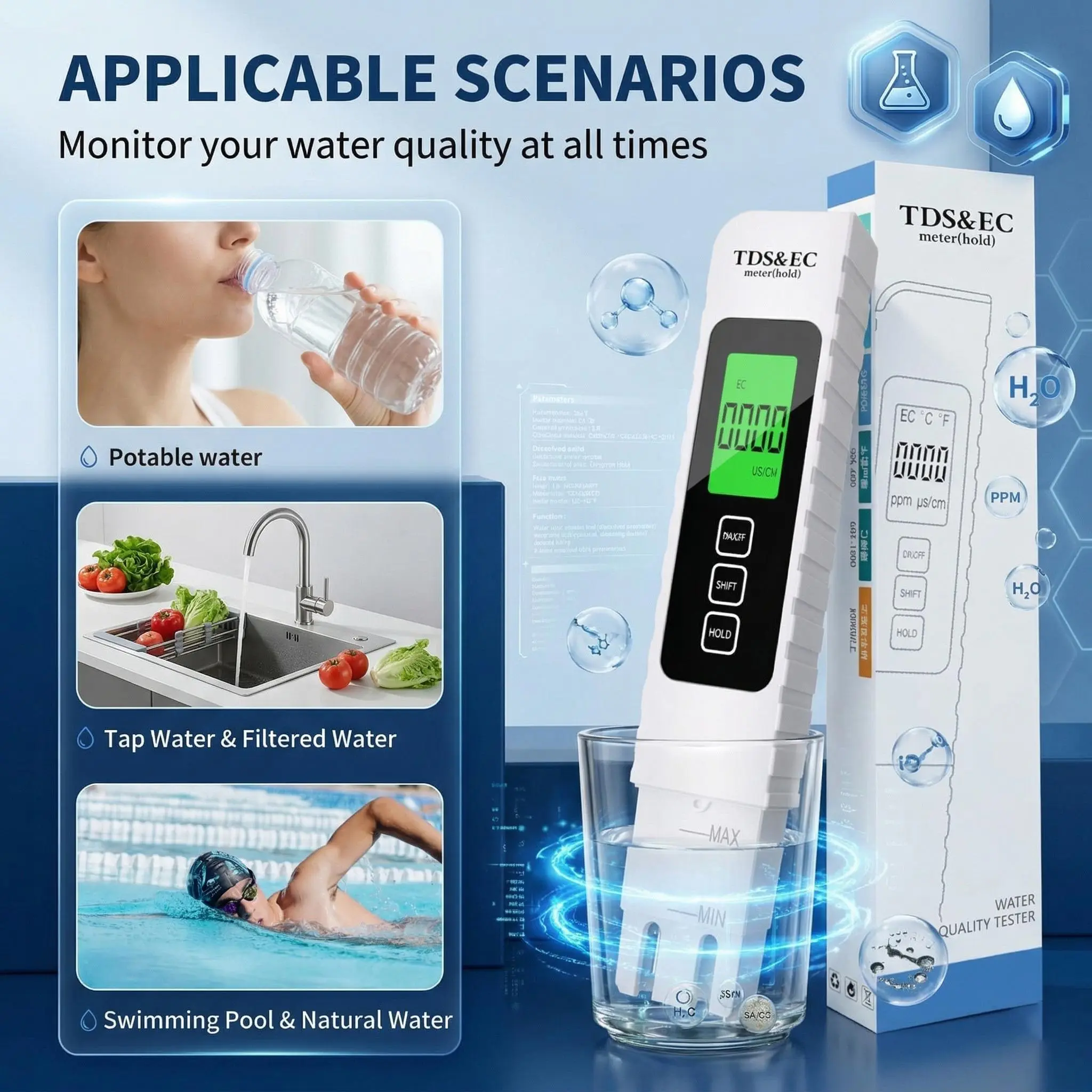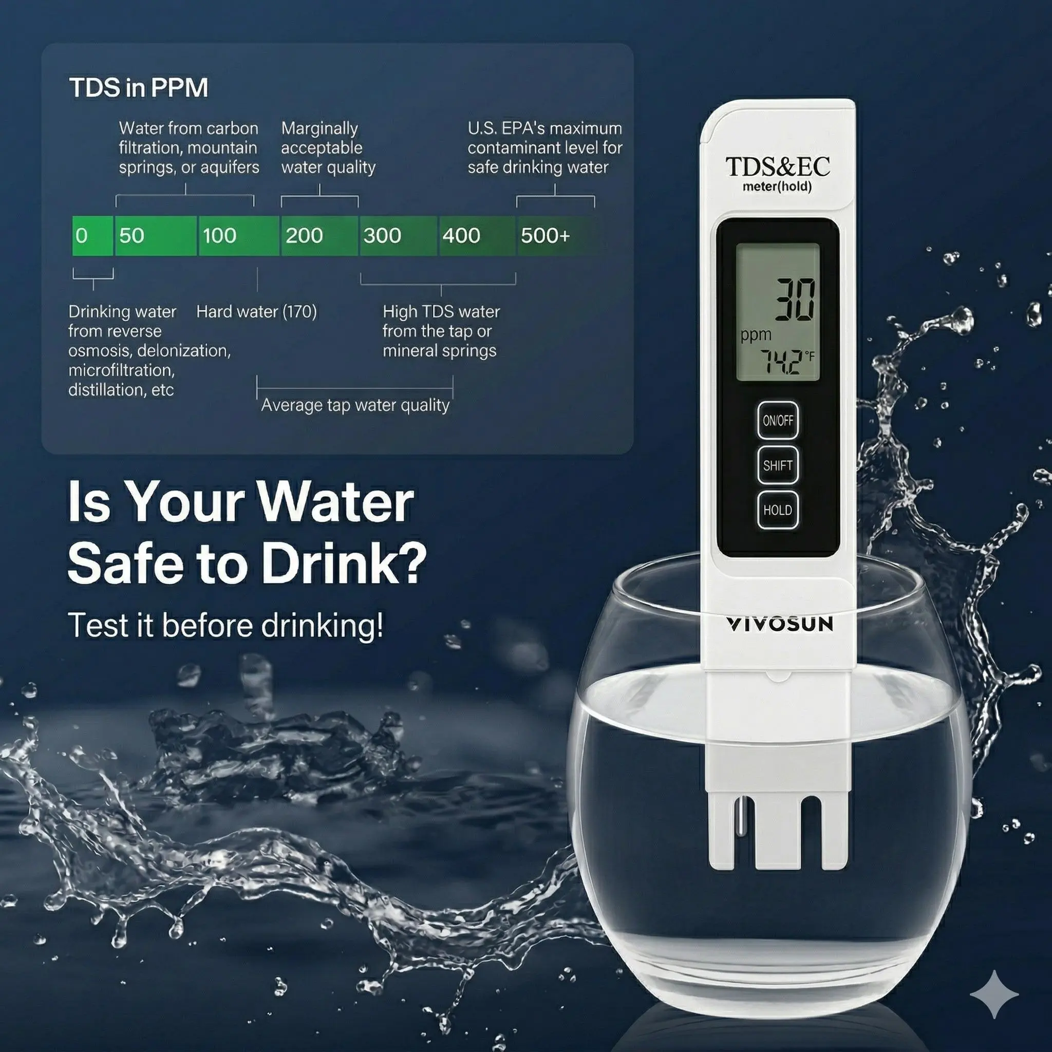 ·【Color Alert System】This digital water tester provides instant visual with a smart display that turns green for normal water (0-50 ppm TDS) and red above 50 ppm.