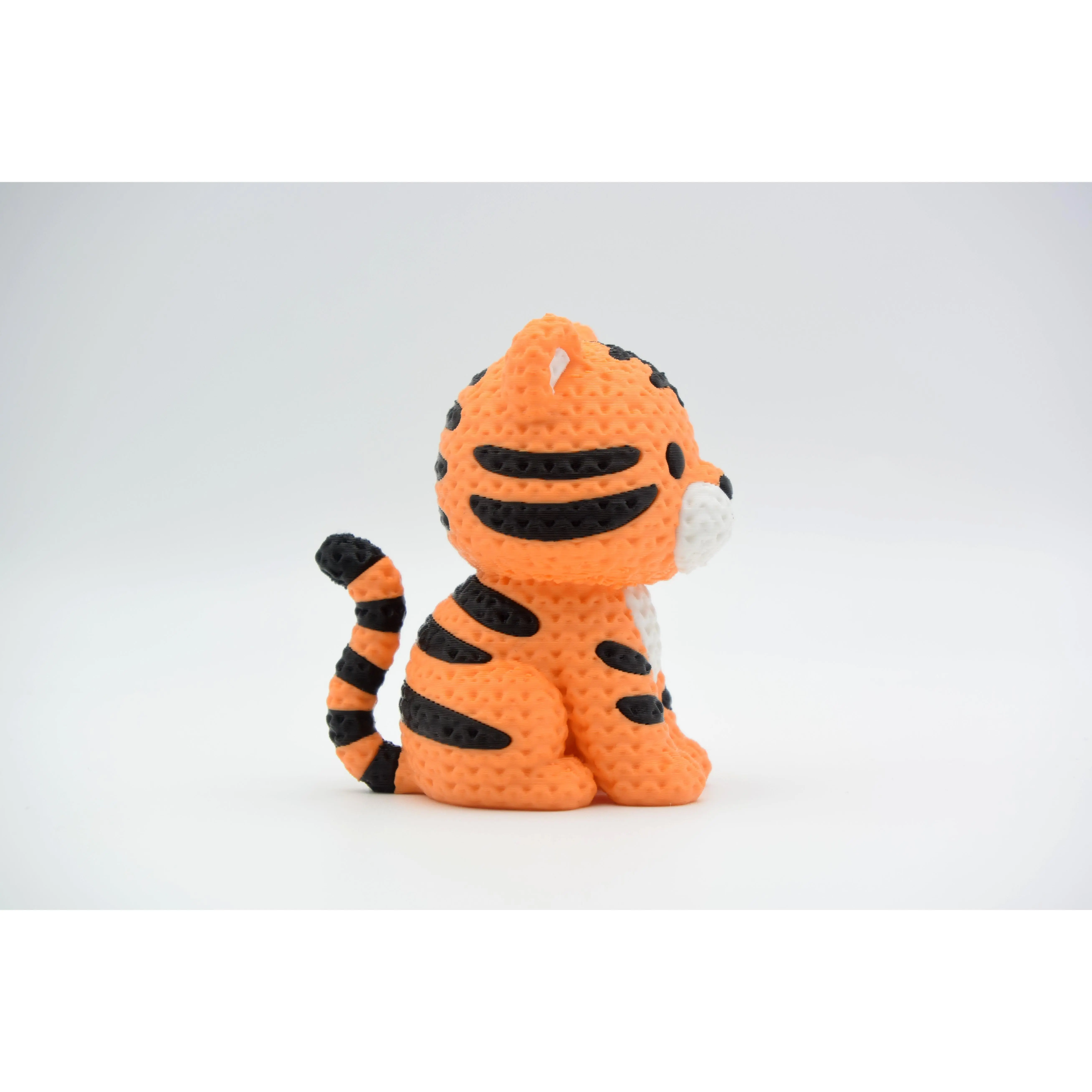This is a 3D-printed model of a stylized, adorable tiger designed to closely resemble a handcrafted knitted or crocheted stuffed toy. The figure is sitting upright and features a highly detailed, ribbed surface texture that perfectly mimics the look of woven yarn stitches. It is colored in vibrant orange with prominent black stripes, tiny round black eyes, and white accents on its belly, paws, and muzzle. Overall, it captures a charming, soft amigurumi aesthetic despite being a solid 3D-printed object.