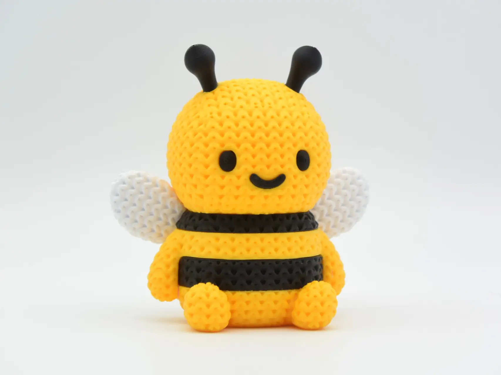 This Knitted Bee is a charming 3D-printable model that captures the cozy, textured aesthetic of a handcrafted crochet toy. The design features a round, friend-shaped body with classic yellow and black stripes, complemented by a pair of soft white wings and two tiny black antennae. With its simple, friendly face and intricate yarn-stitch detail, this cheerful insect serves as a perfect decorative piece for a desk or shelf, bringing a touch of handmade warmth to any space without the need for actual needles and thread.