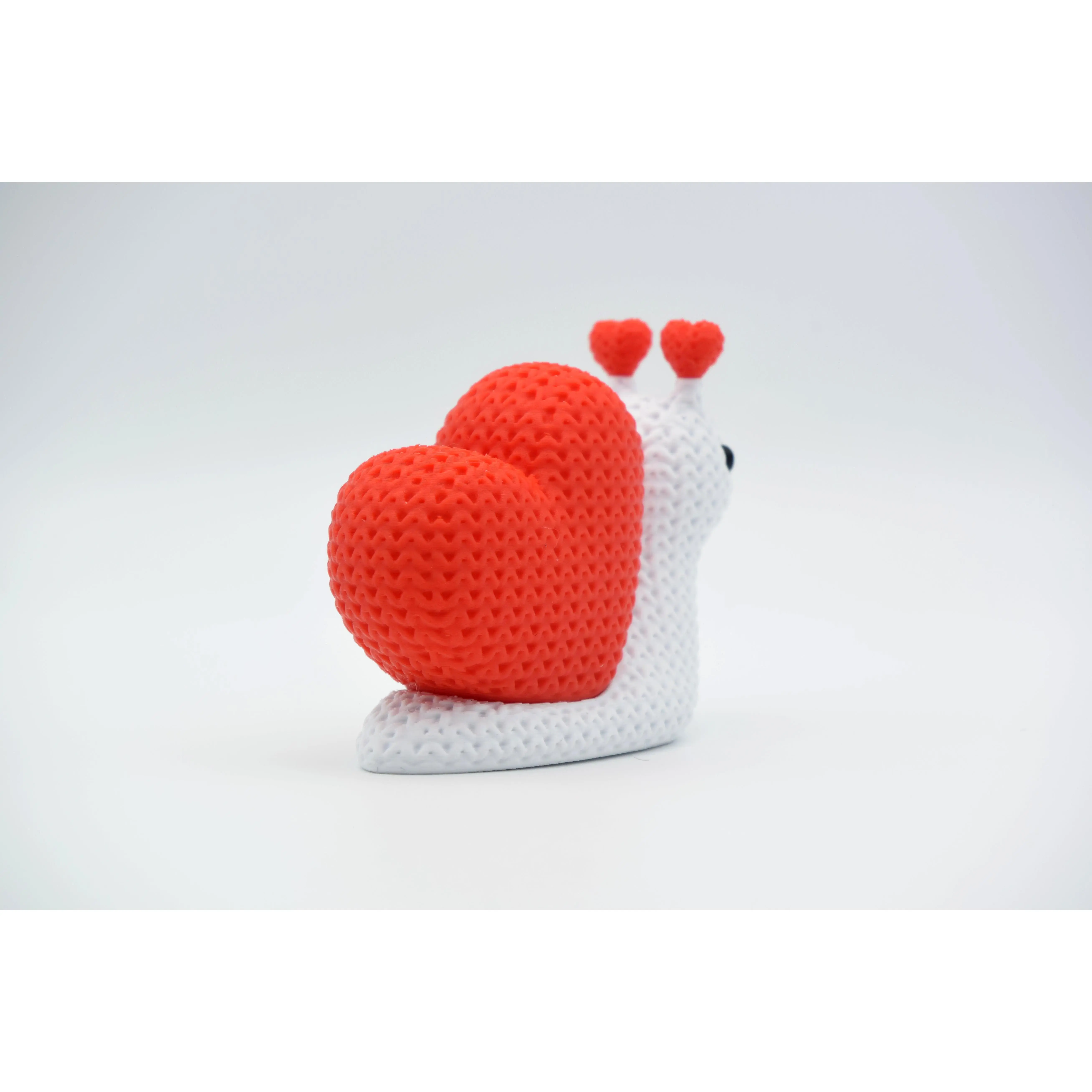 This Knitted Valentine's Day Snail is a heartwarming 3D-printable model that mimics the look of a handcrafted crochet toy. The design features a light-colored, textured body with small black eyes and two adorable antennae topped with tiny hearts. Its shell is a large, vibrant red heart with an intricate knitted pattern, giving the entire piece a cozy and tactile aesthetic. This friend-shaped creature is a perfect decorative accent for a shelf or desk and makes for a thoughtful, handmade-style gift for someone special.