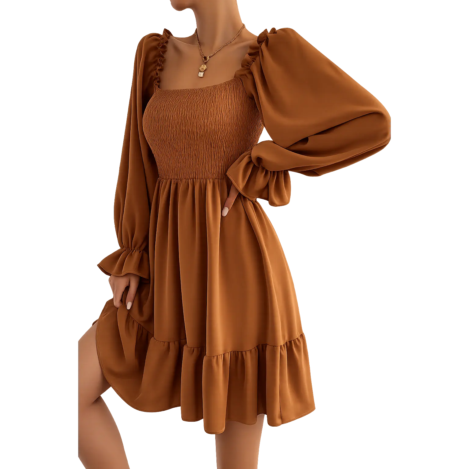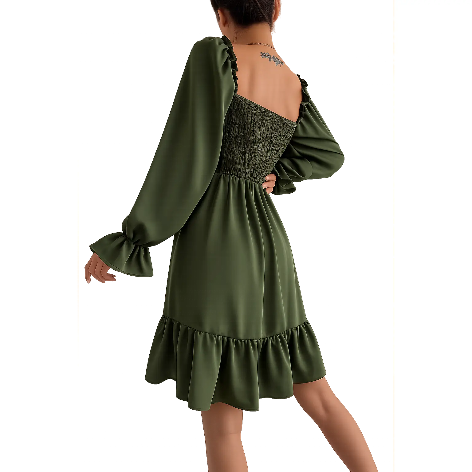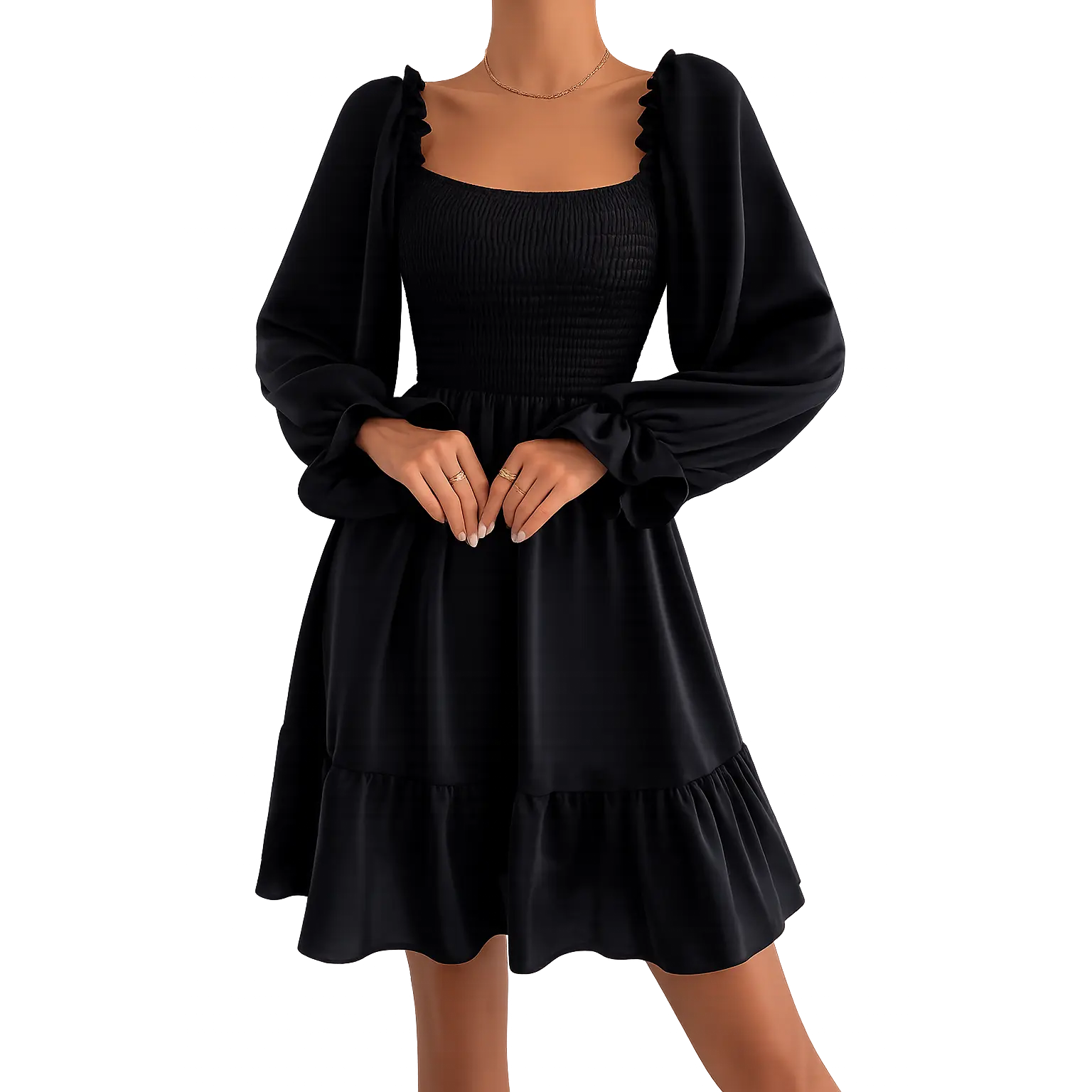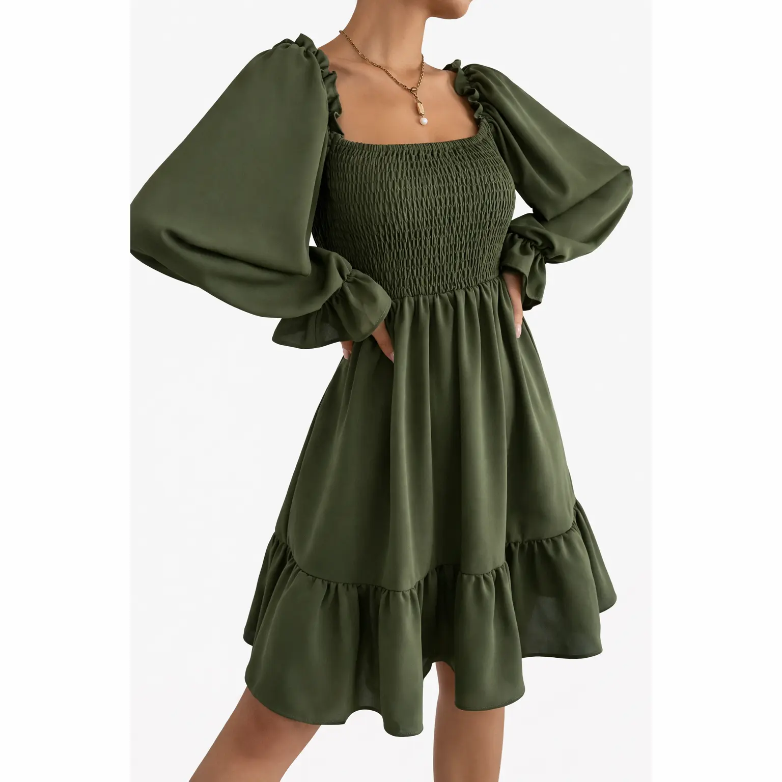 2026 Spring and Summer Leisure Solid Color Square Collar Long Sleeve Waist-Cinched A-Line Skirt