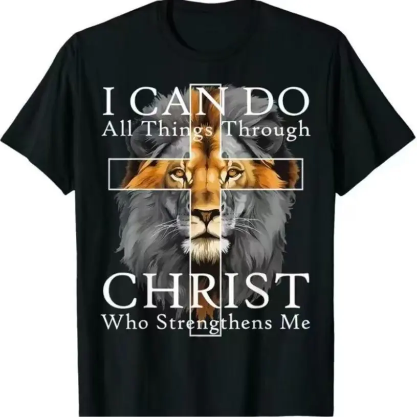 Featuring a strikinglion and cross designpaired with anInspirational Bible verseThis shirt symbolizes strength, courage, and faith. Whether you're attending a service, spending time with family, or simply expressing your beliefs, this tee is a meaningful way to showcase your values. It'smotivational messageIt also makes it an ideal conversation starter, allowing you to share positivity wherever you go.