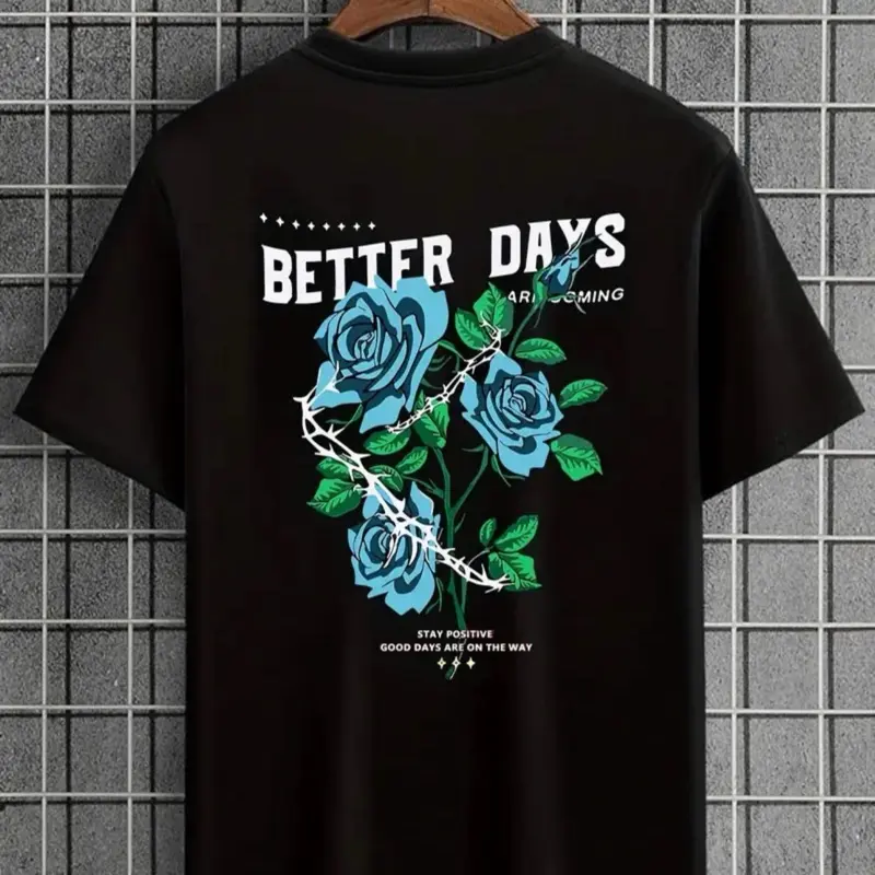 Better Days Are Coming - Blue Roses & Thorns Design on Black T-Shirt - Stay Positive Good Days On The Way