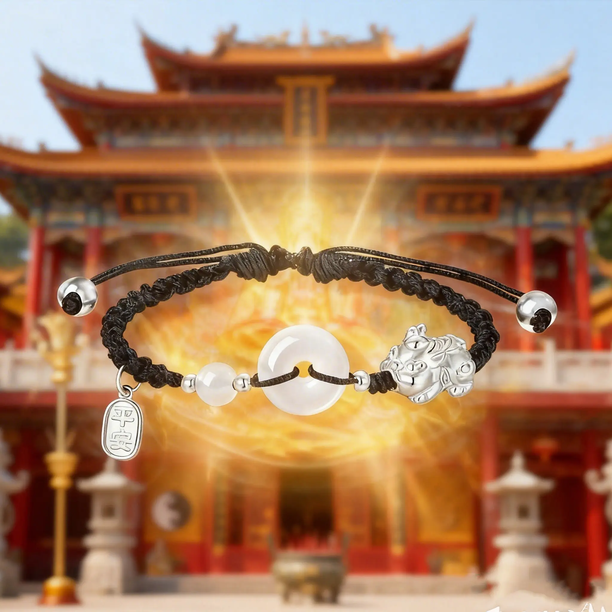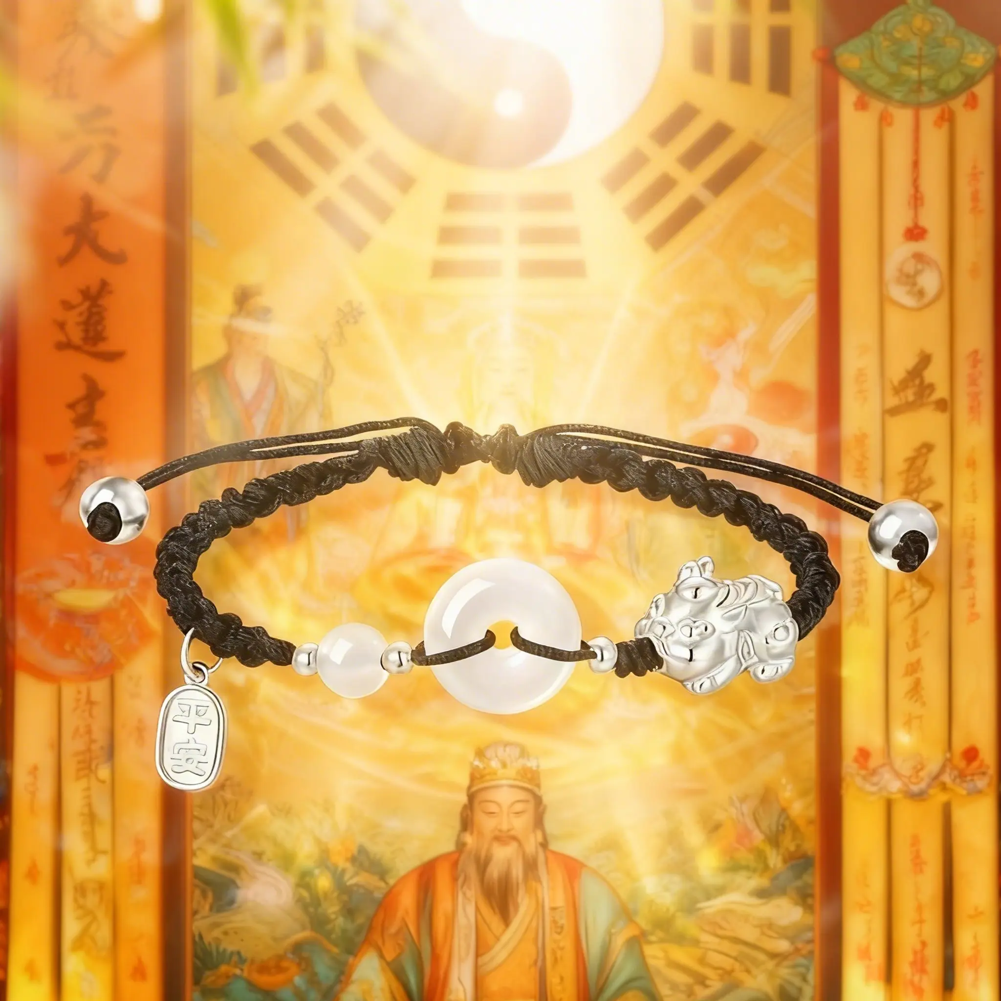 This bracelet deeply integrates the ancient wisdom of Taoism. The peace pendant can purify negative vibrations and build a safe and stable protective aura around you. In traditional Eastern culture, the Pi Xiu is a Taoist auspicious beast that attracts wealth. It feeds on gold, silver and jewels, taking in but never giving out, symbolizing the accumulation and preservation of wealth. It can gather the wealth energy of heaven and earth and help accumulate wealth. The pink woven rope: harmonizes the emotional energy field, deepens mutual understanding and tacit understanding, and infuses warmth and tenderness into intimate relationships.