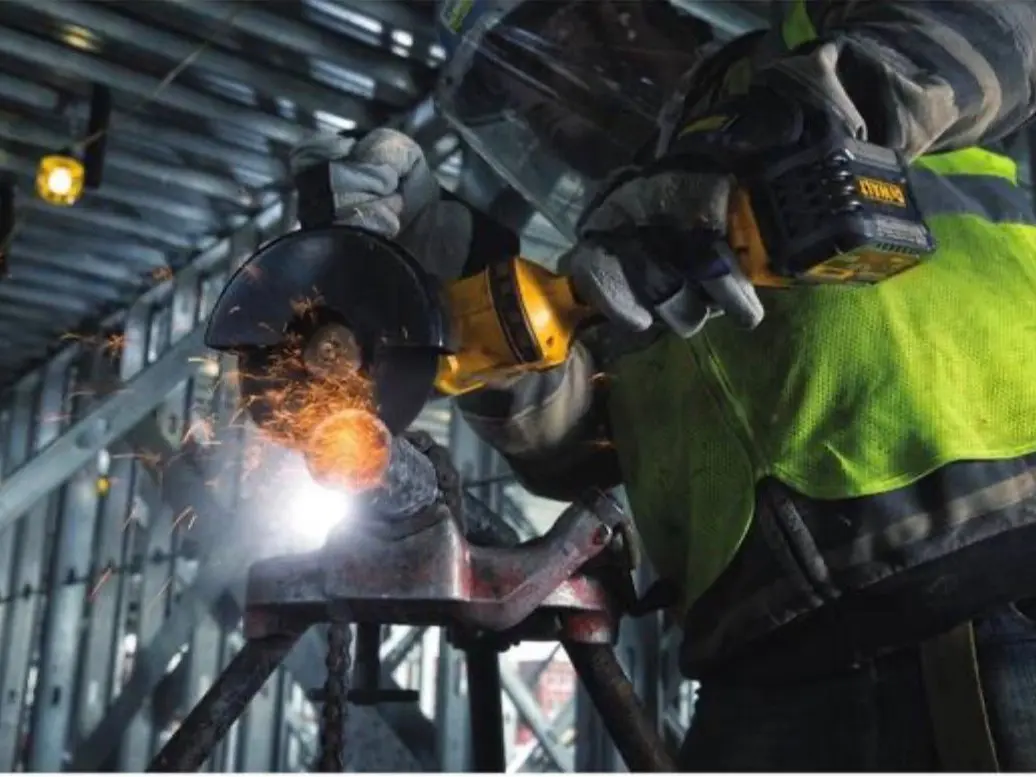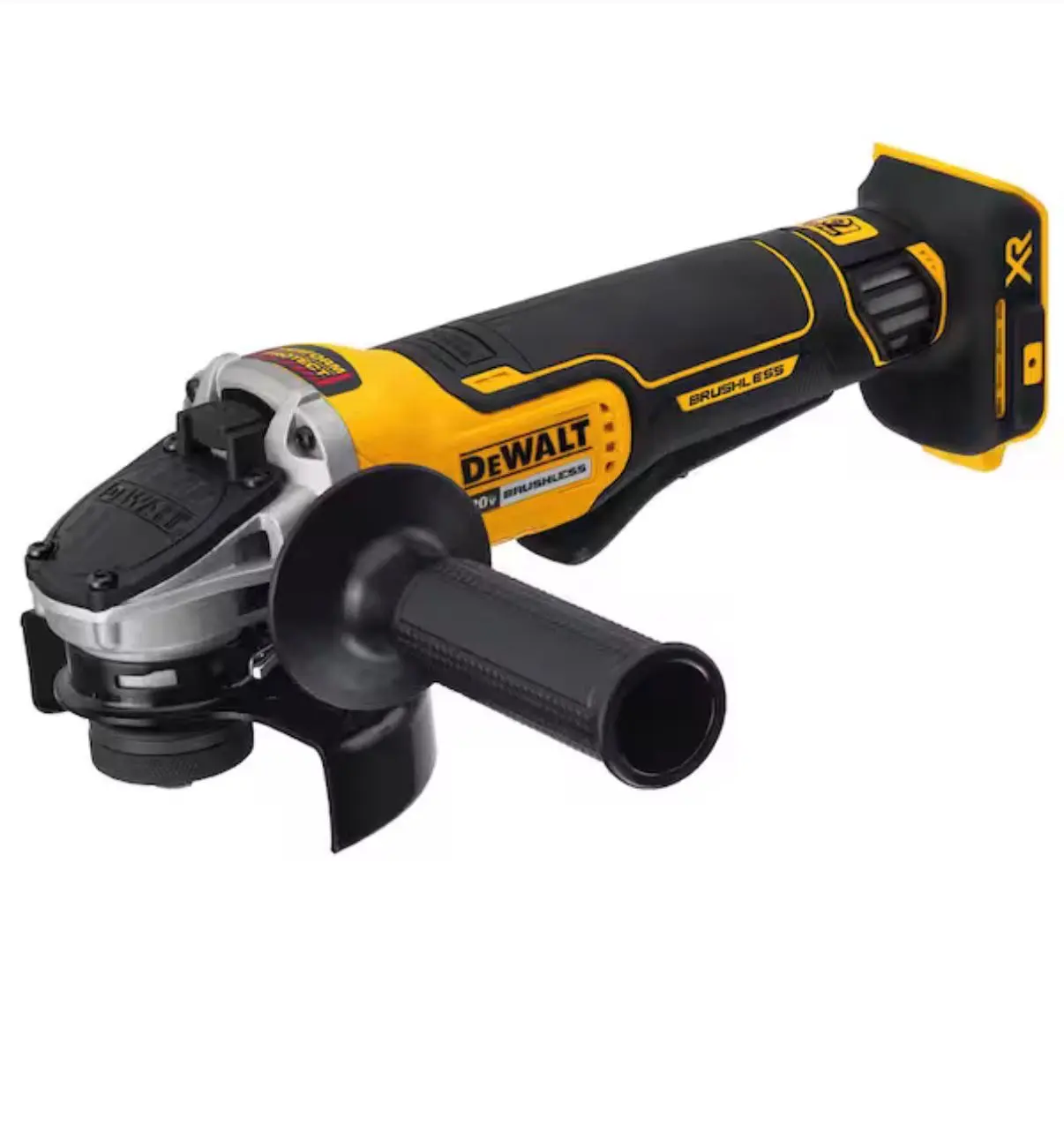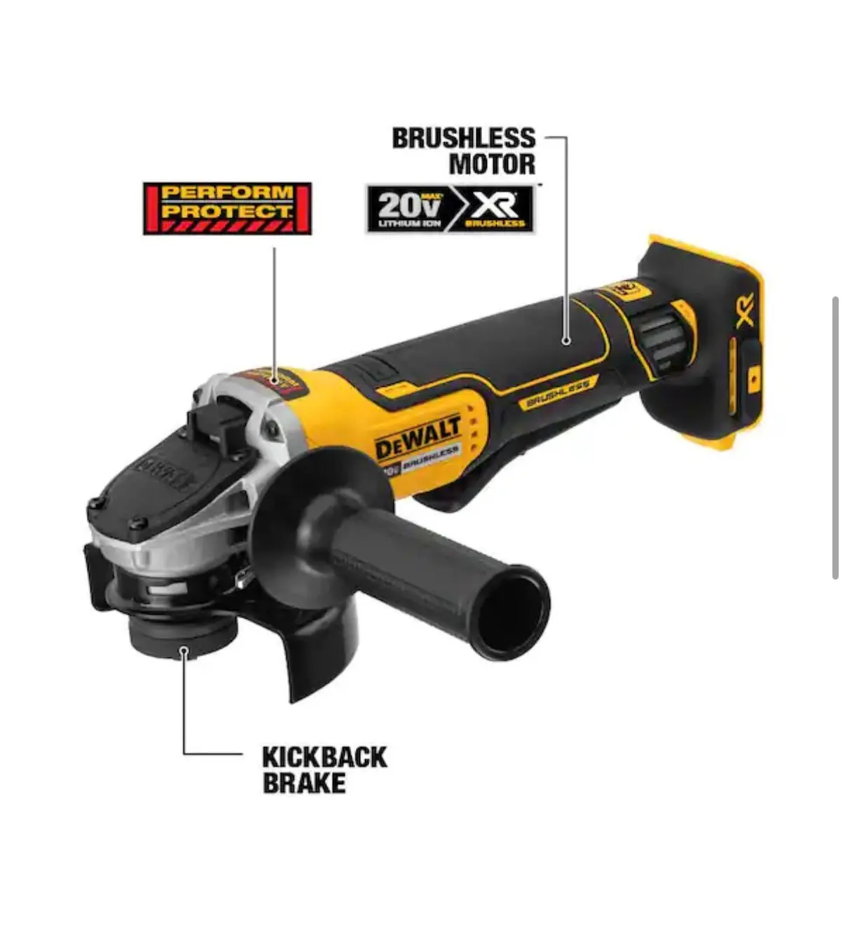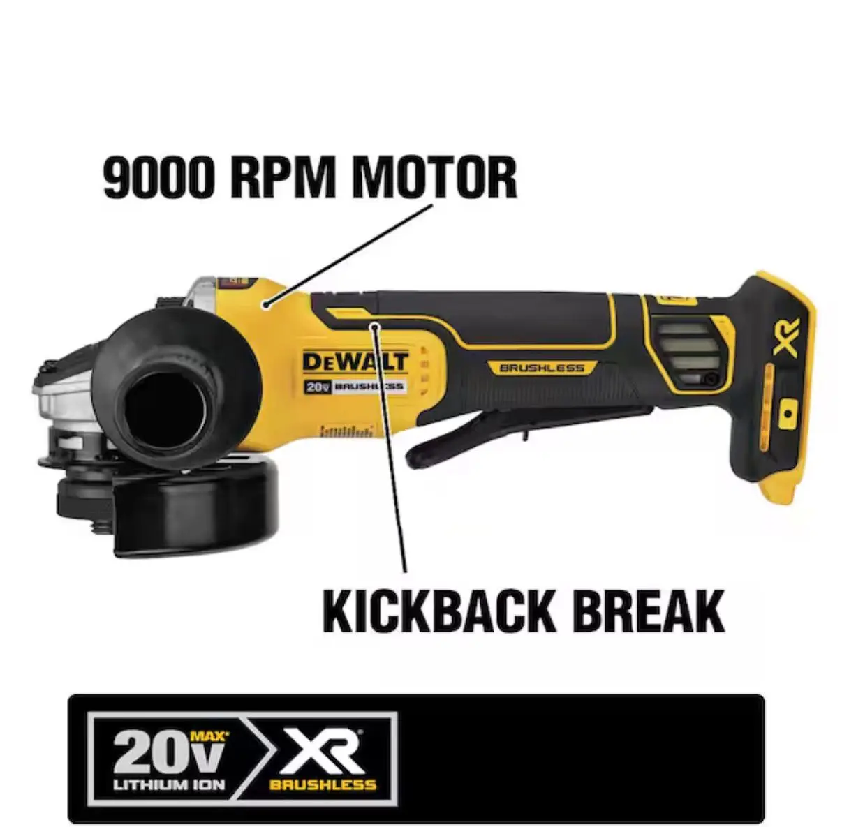 The 20-Volt MAX XR Angle Grinder features a brake, E-Clutch System, and Kickback Brake. The brake quickly brings the wheel to a stop in two seconds or less when the trigger is released. The E-Clutch System automatically shuts down the motor when a wheel pinch in detected. These two features working together to shut the tool down without user interaction, called the Kickback Brake. Additionally, the grinder features a One-Touch Guard, which allows for single-action adjustments to change guard position.