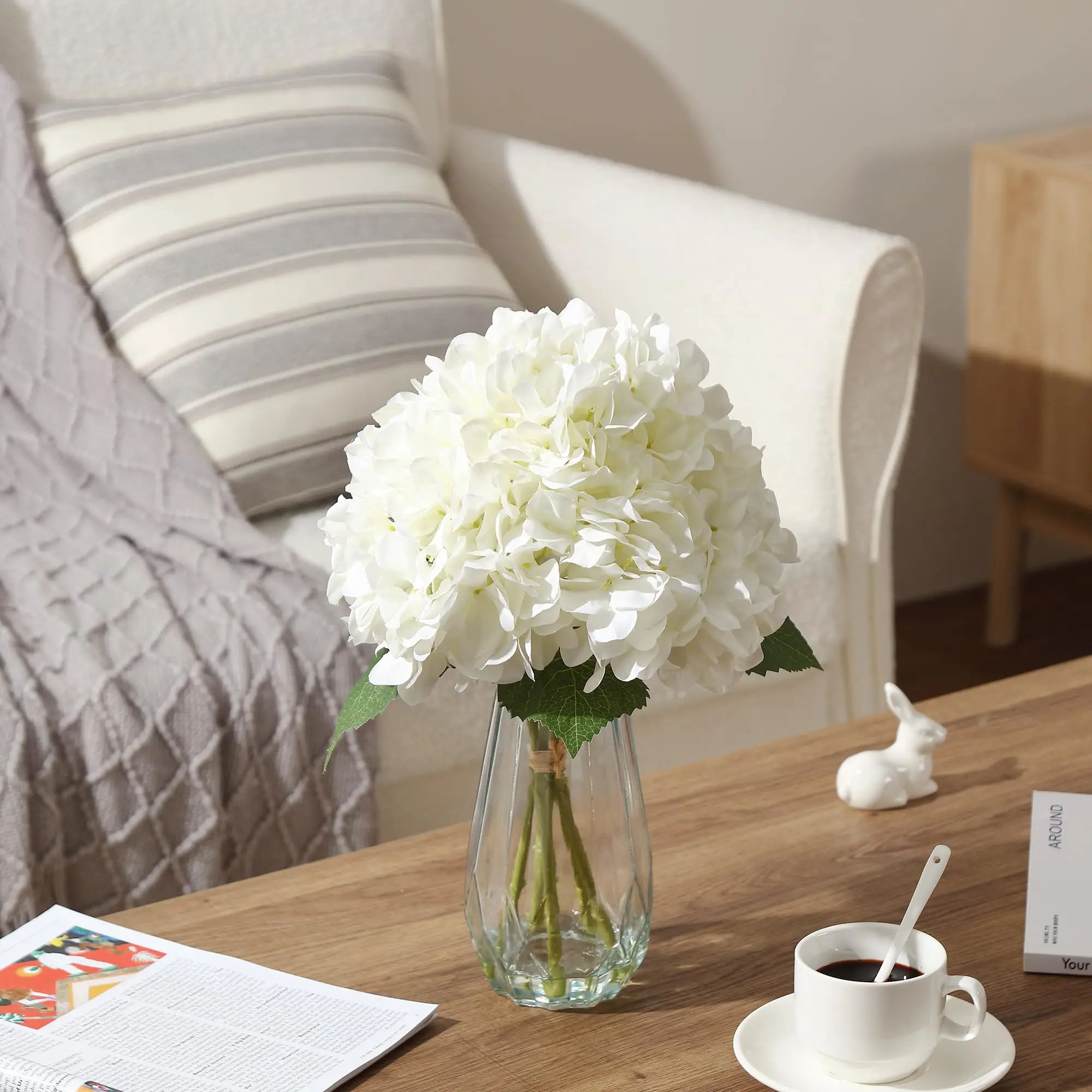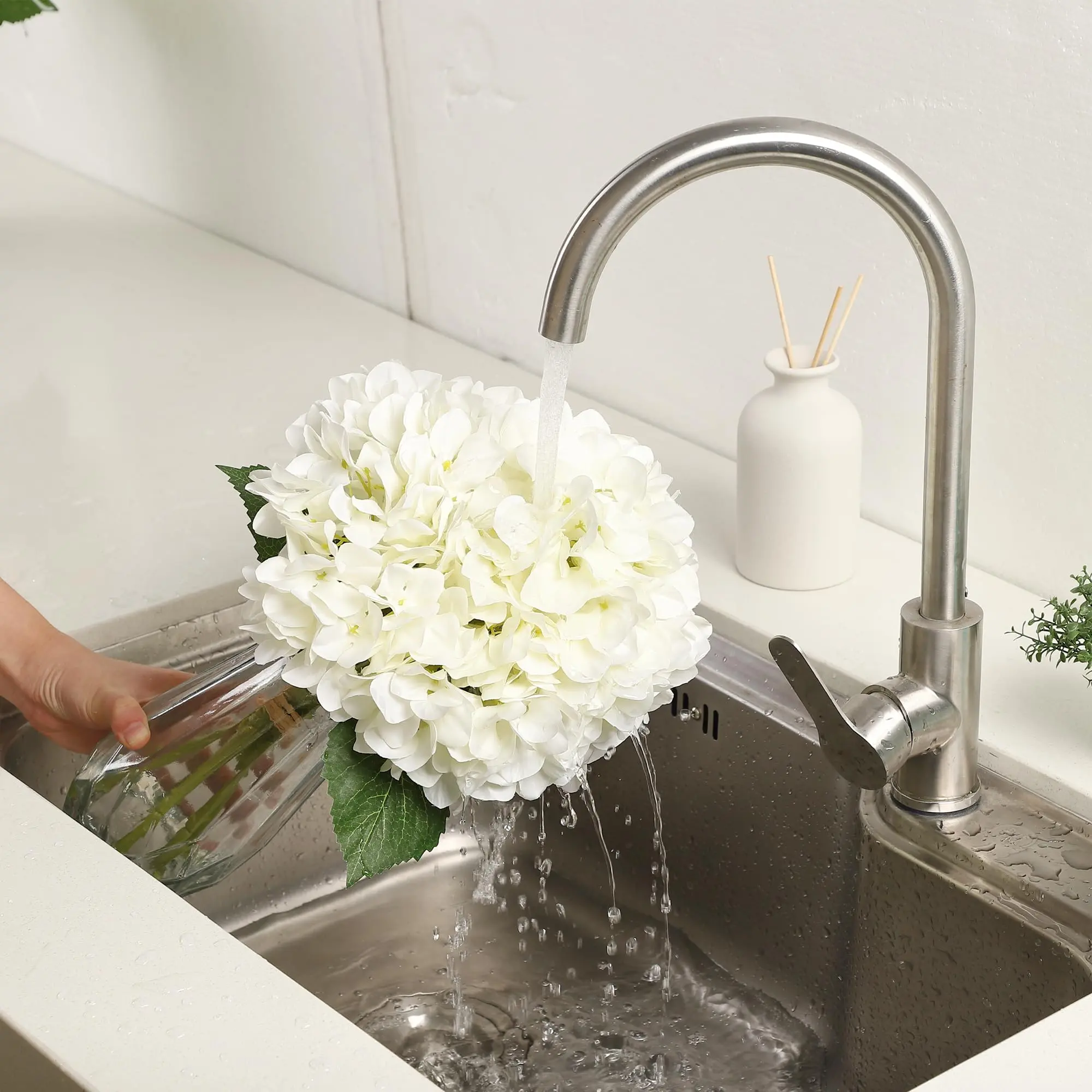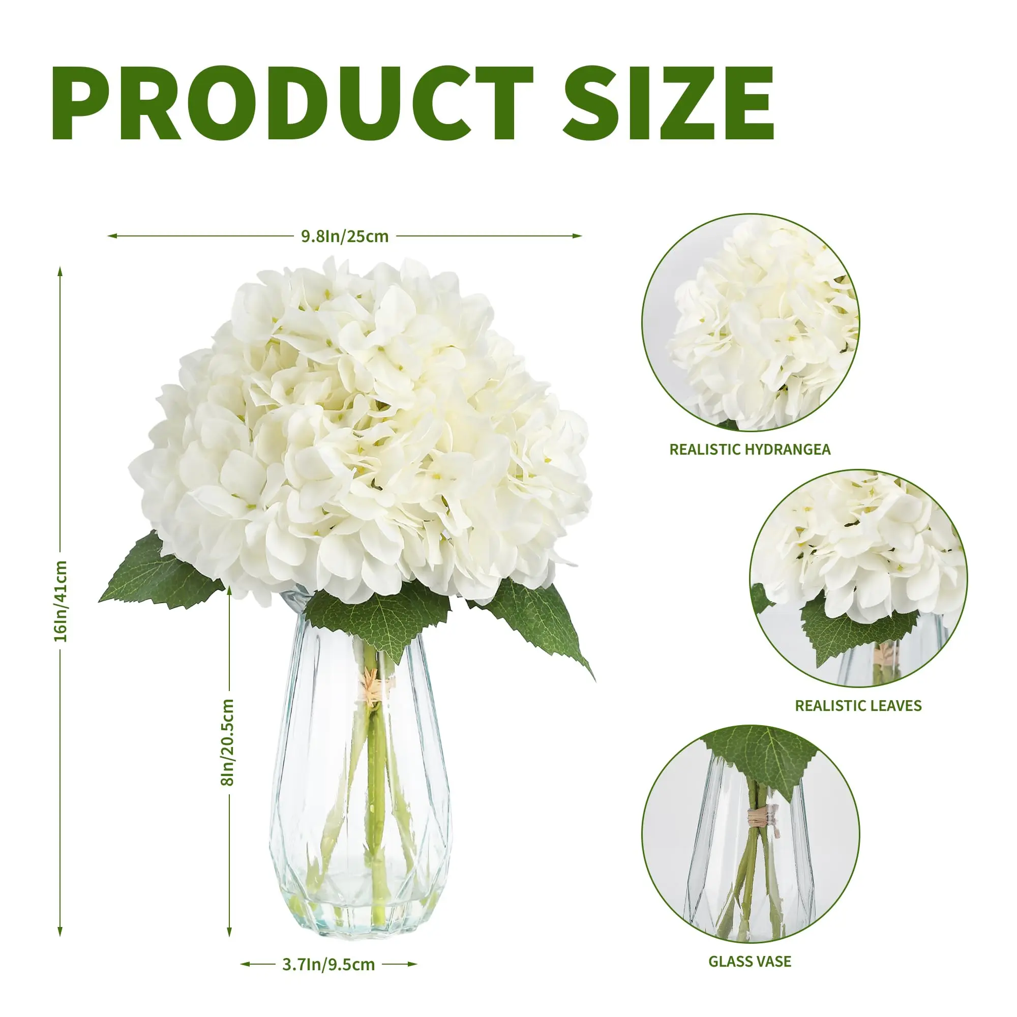 · Ultra Realistic Design with Faux Water Vase:Includes clear glass vase filled with realistic faux water effect for an authentic appearance. This artificial flower arrangement looks like freshly placed hydrangeas, making it perfect for table centerpiece décor or shelf styling.