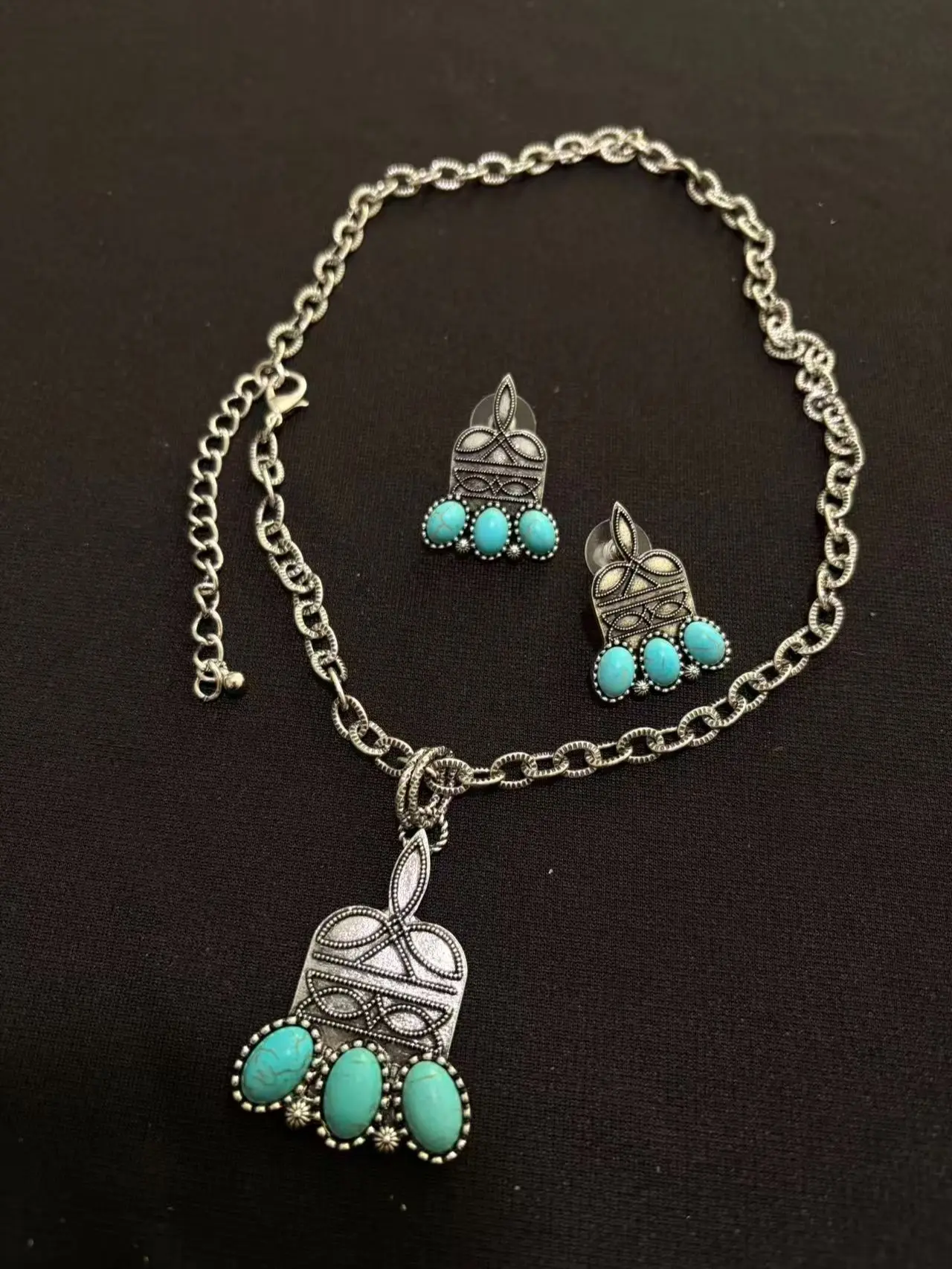 Western style jewelry set featuring a detailed drop pendant design with turquoise-style stones and engraved metal accents. Includes a necklace and matching earrings for a clean and bold cowgirl look. Lightweight and comfortable for everyday wear or special occasions. Adjustable chain for a flexible fit, perfect for pairing with denim, dresses, or layered western outfits.