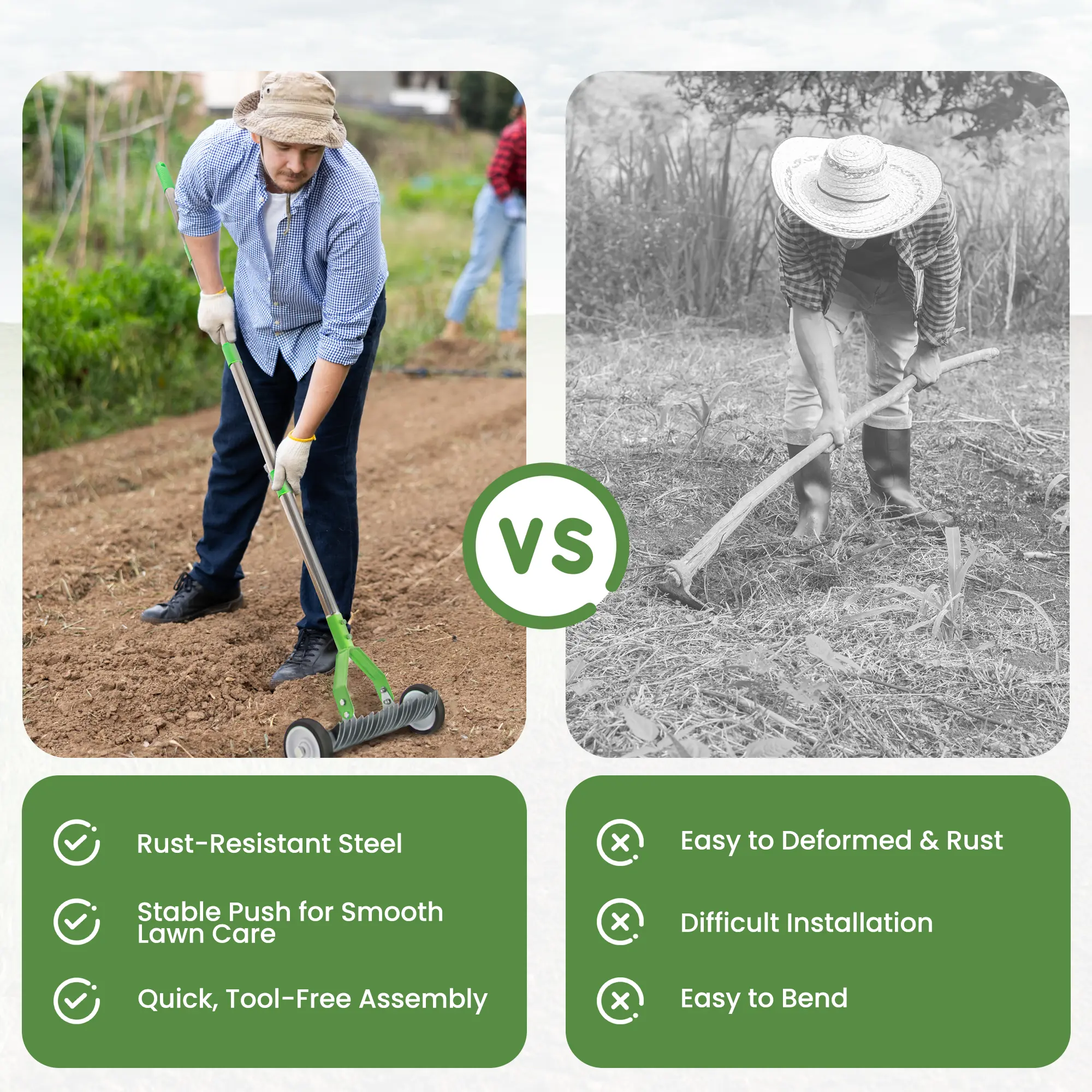 The comb teeth are made of metal, which has high hardness and is not easily deformed, capable of withstanding the wear and tear of daily lawn maintenance;the stainless steel shaft is rust-proof and corrosion-resistant, suitable for outdoor humid environments;the connection structure uses reinforced screws, making the whole structure stable and not prone to loosening, with a longer service life