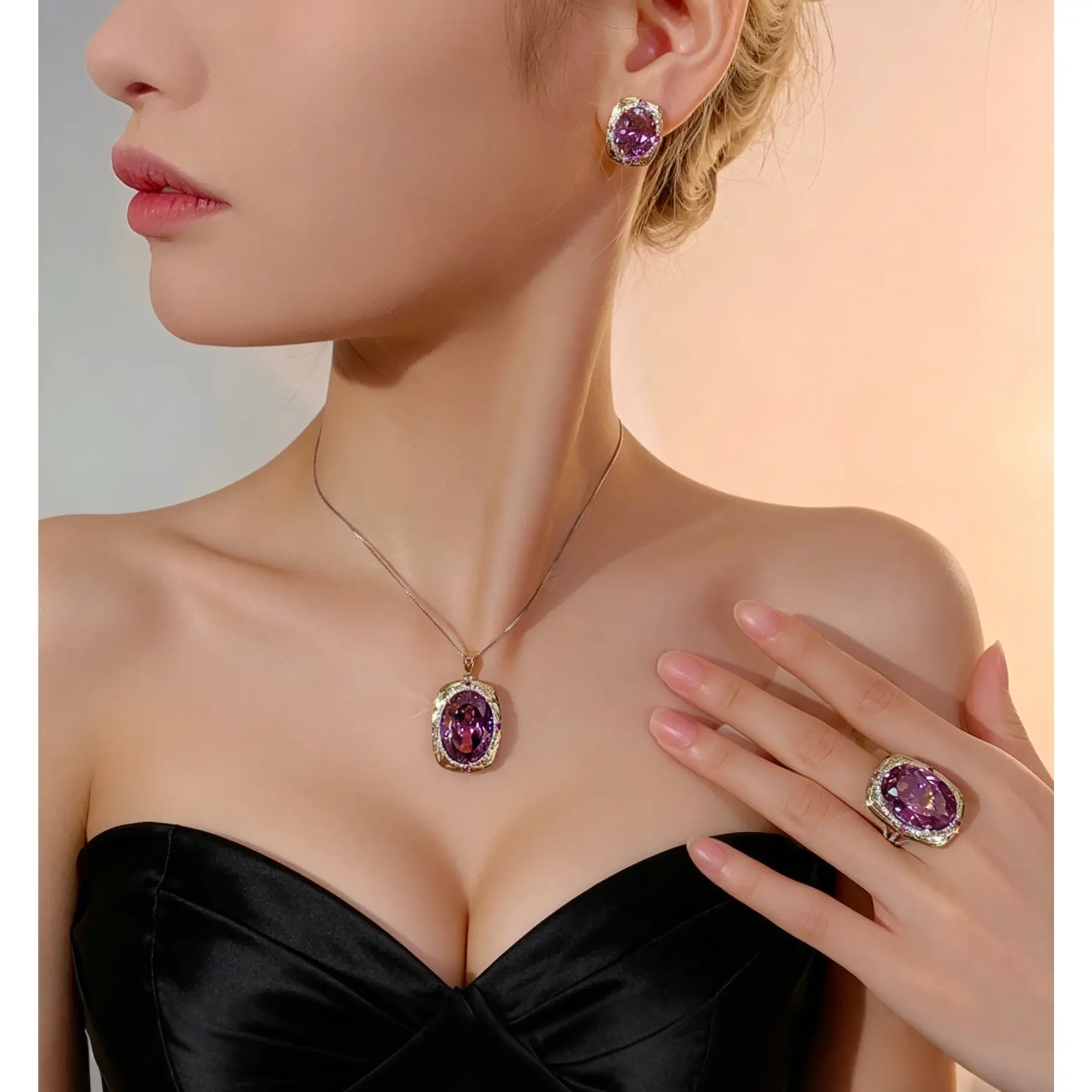 Vintage design: The oval gemstone is surrounded by sparkling CZ diamonds, enhancing its luxury. This set is a timeless choice for women who love fashion and elegance
