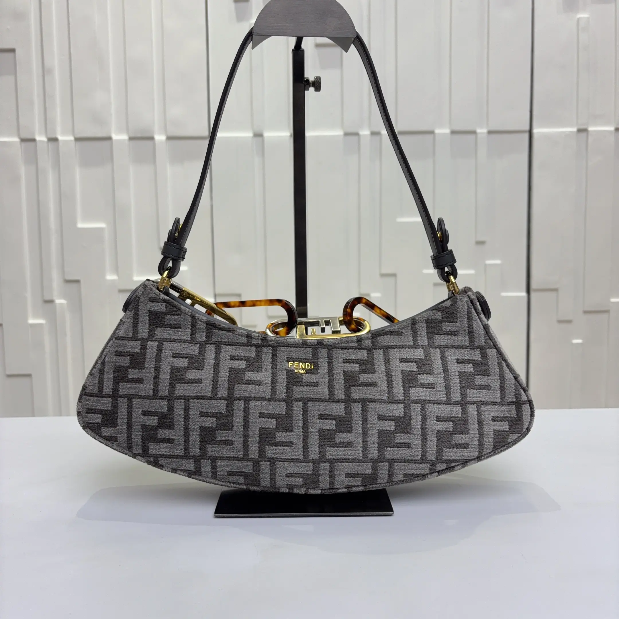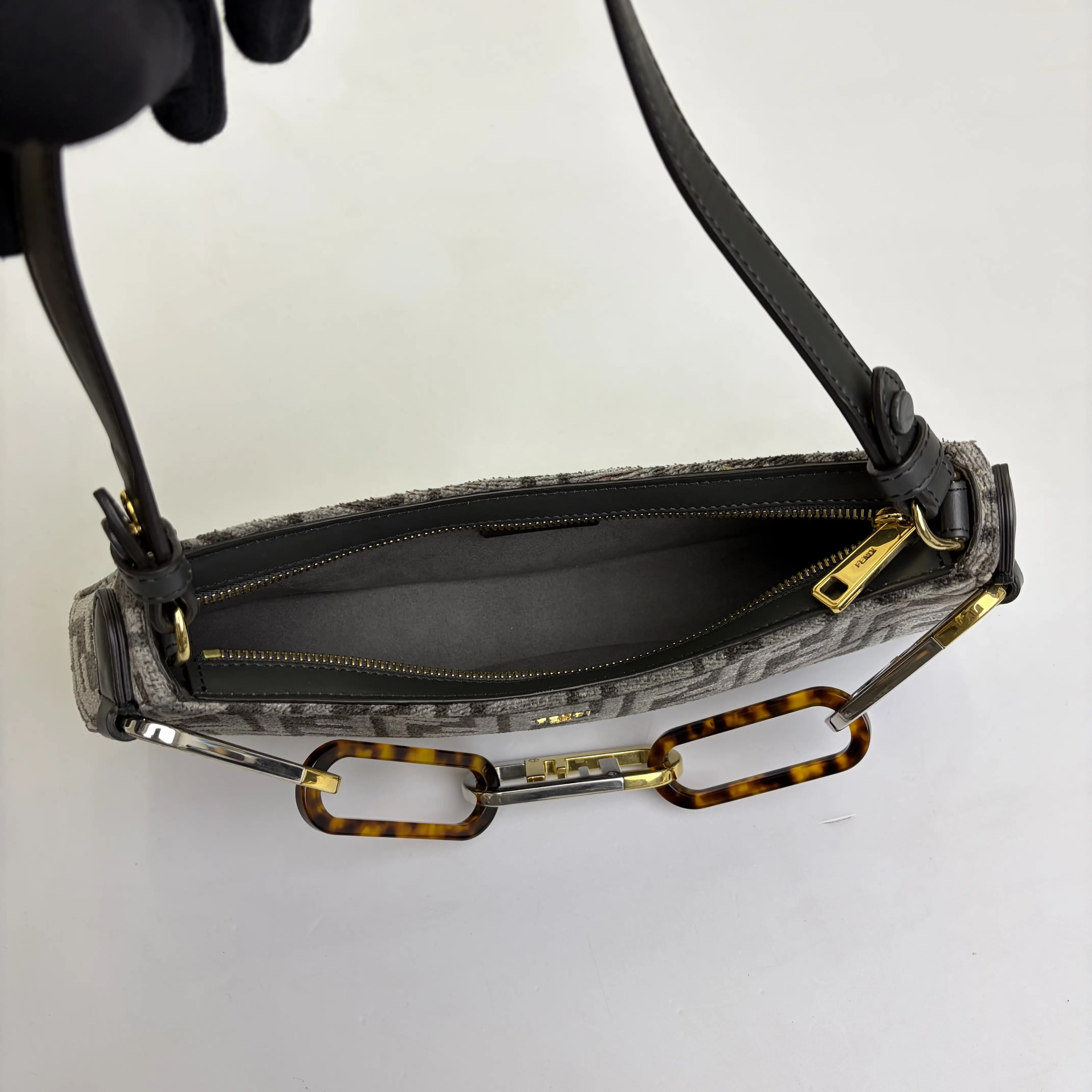 ·Design: Sleek grey FF monogram jacquard exterior with a polished gold-tone Fendi logo plaque, featuring a distinctive tortoiseshell-accented O'Lock closure and adjustable leather shoulder strap for effortless underarm carry.