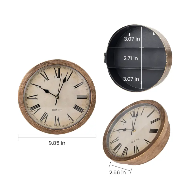 10-inch silent wall clock safe with a secret coin compartment.Multifunctional for storing cash, jewelry, and valuables.Suitable for homes, offices, living rooms, etc.Safe and reliable with a vintage decor.