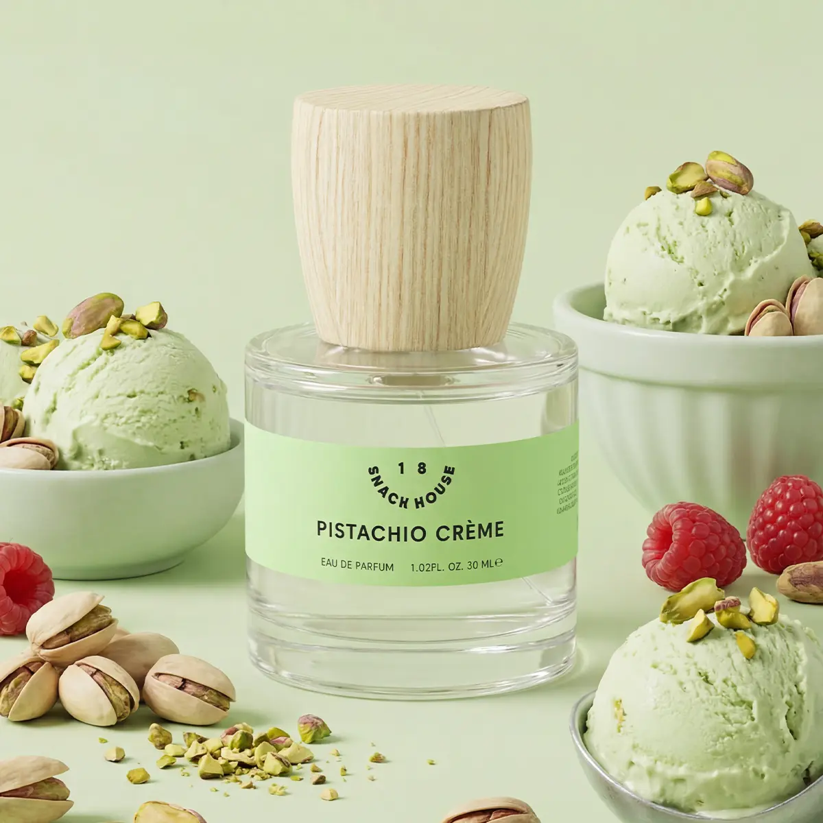A smooth scoop of pistachio gelato topped with whipped cream. It’s a clean, nutty sweetness that stays soft and creamy on the skin.