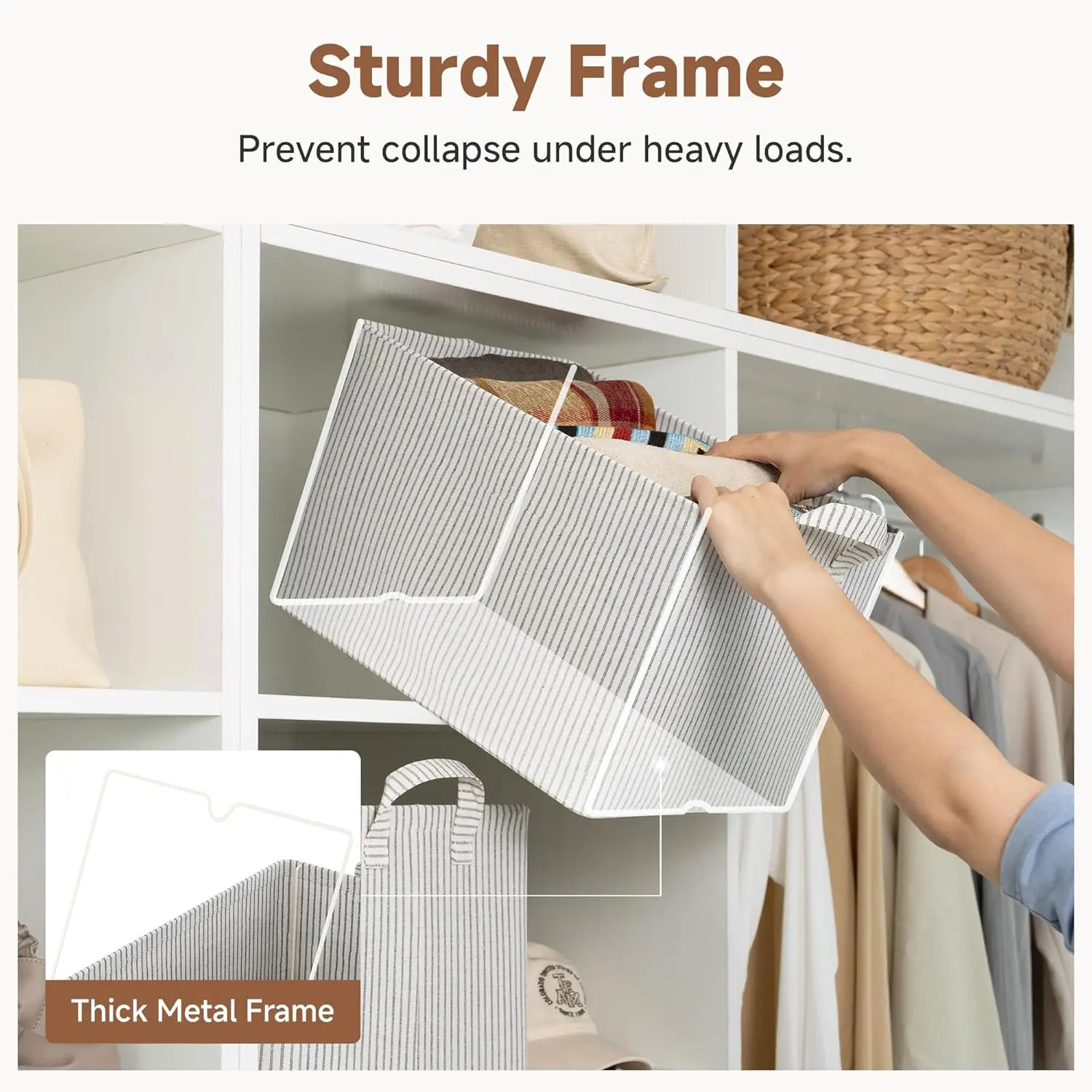 Premium Quality Construction: Crafted from high-quality fabric with a heavy-duty MDF bottom board and a sturdy metal frame for lasting durability. The reinforced structure allows each bin to stand upright on its own, even when empty.